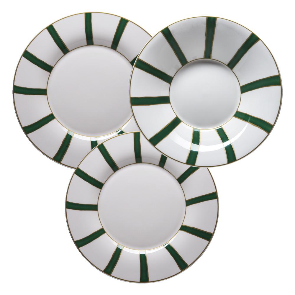 Crafted around year 1770, the pattern “A striche verdi e oro" by Geminiano Cozzi Venezia 1765 is simple, almost “abstract”. It is a quest for the pure form through colors and geometric shapes.The radial green striped decoration, closed by a thin brushstroke in gold, shows a timeless color choice and combination wisely chosen by the painters of the time.Among the vast assortment of Geminiano Cozzi works, this original decoration was painted in many different colors and combinations, still very modern and source of inspiration for almost all porcelain factories, both Italian and foreign, established during the centuries.