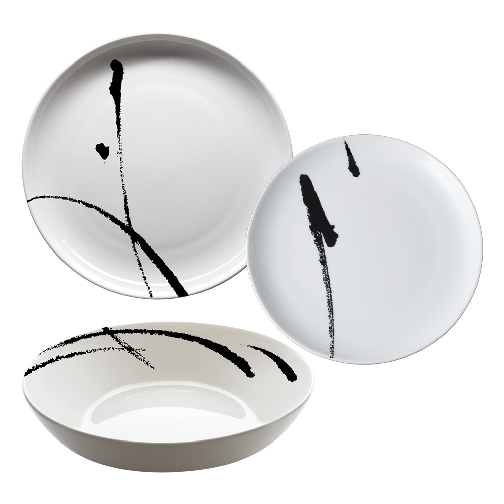 Il set 3 pezzi Brush Nero è la soluzione versatile per una mise en place dal segno moderno. Comprende piatto piano, fondo e dessert in bone china impreziositi da una raffinata pennellata nera. Tutto il servizio trasmette personalità, tradizione rivisitata e un equilibrio perfetto tra funzionalità e arte. Ideale come regalo di stile o per reinventare la tavola quotidianamente con la firma Geminiano Cozzi.