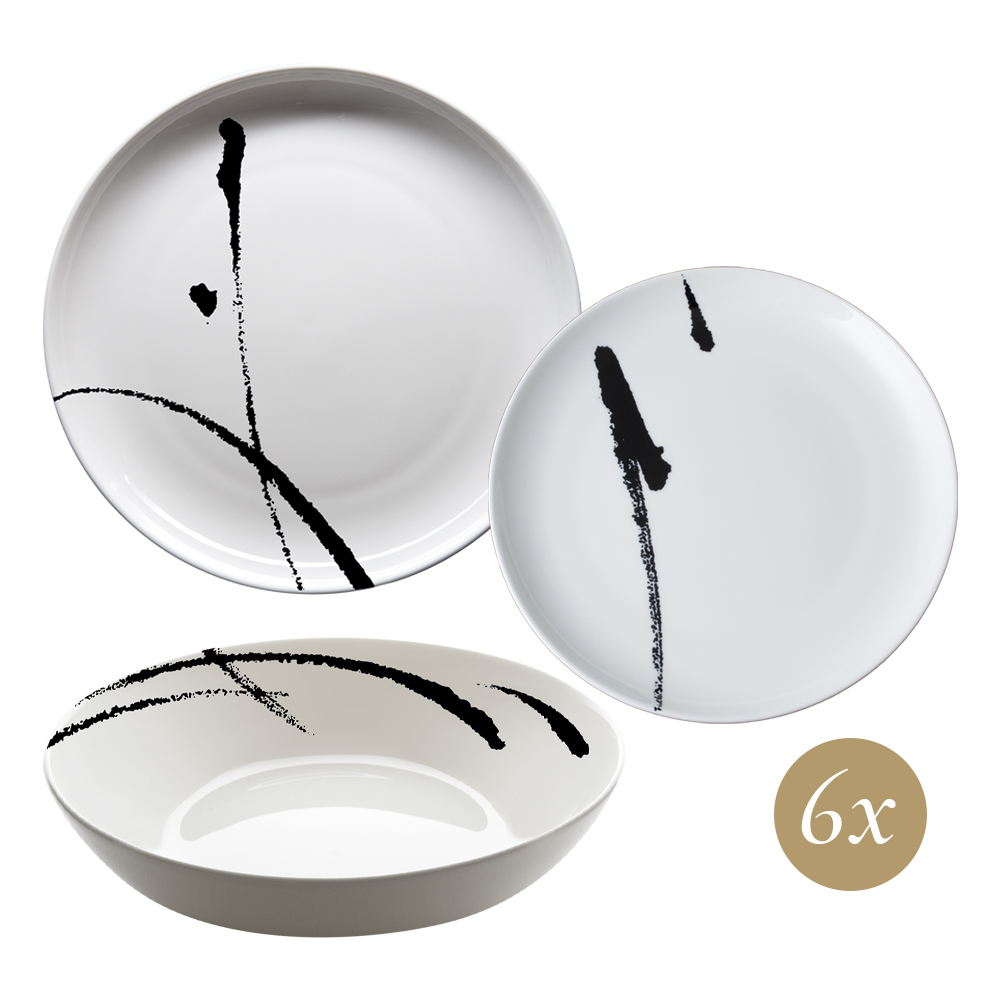 Il set 18 pezzi Brush Nero rappresenta il massimo dell'ospitalità raffinata. Ogni articolo, dal piatto piano a quello fondo, fino a quello per il dessert, spicca per la superficie in bone china decorata con una vivace pennellata nera, sinonimo di stile assoluto. Un servizio completo per chi ama sorprendere a tavola con un tocco moderno, progettato per resistere al tempo e accompagnare sia i quotidiani convivii sia i momenti indimenticabili.
