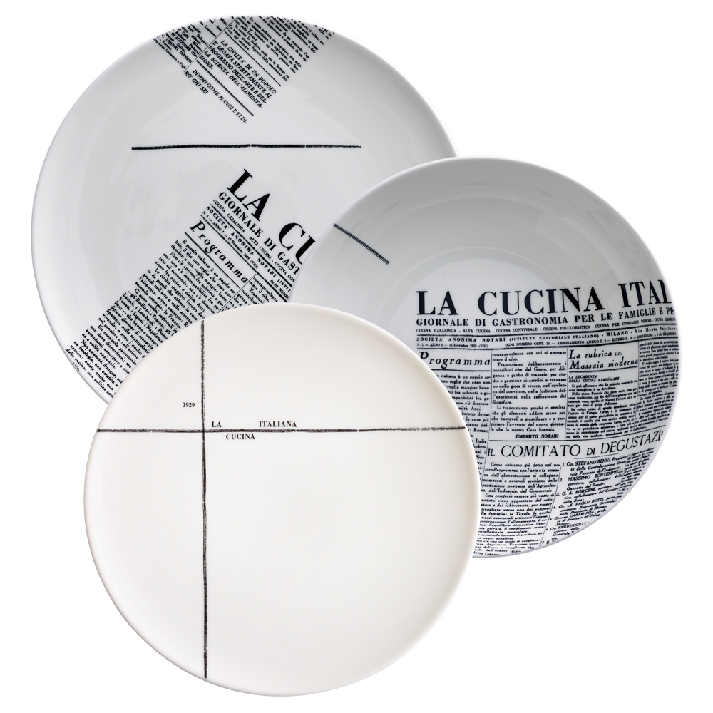 Set composto da piatto piano, piatto fondo e dessert in raffinata bone china. Ogni pezzo della collezione Geometric è decorato con motivi geometrici bianco-neri ispirati alla copertina originale e alle grafiche editoriali d'archivio: linee rette, segmenti, blocchi e piccoli estratti testuali ricreano sulle forme morbide un'atmosfera razionalista e moderna. L'insieme offre una mise en place pulita, elegante e ricca di citazioni storiche.