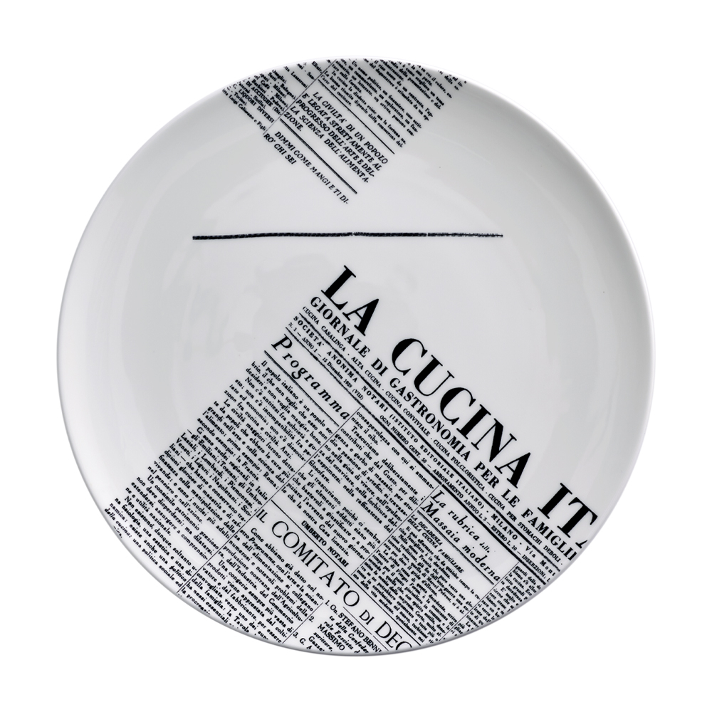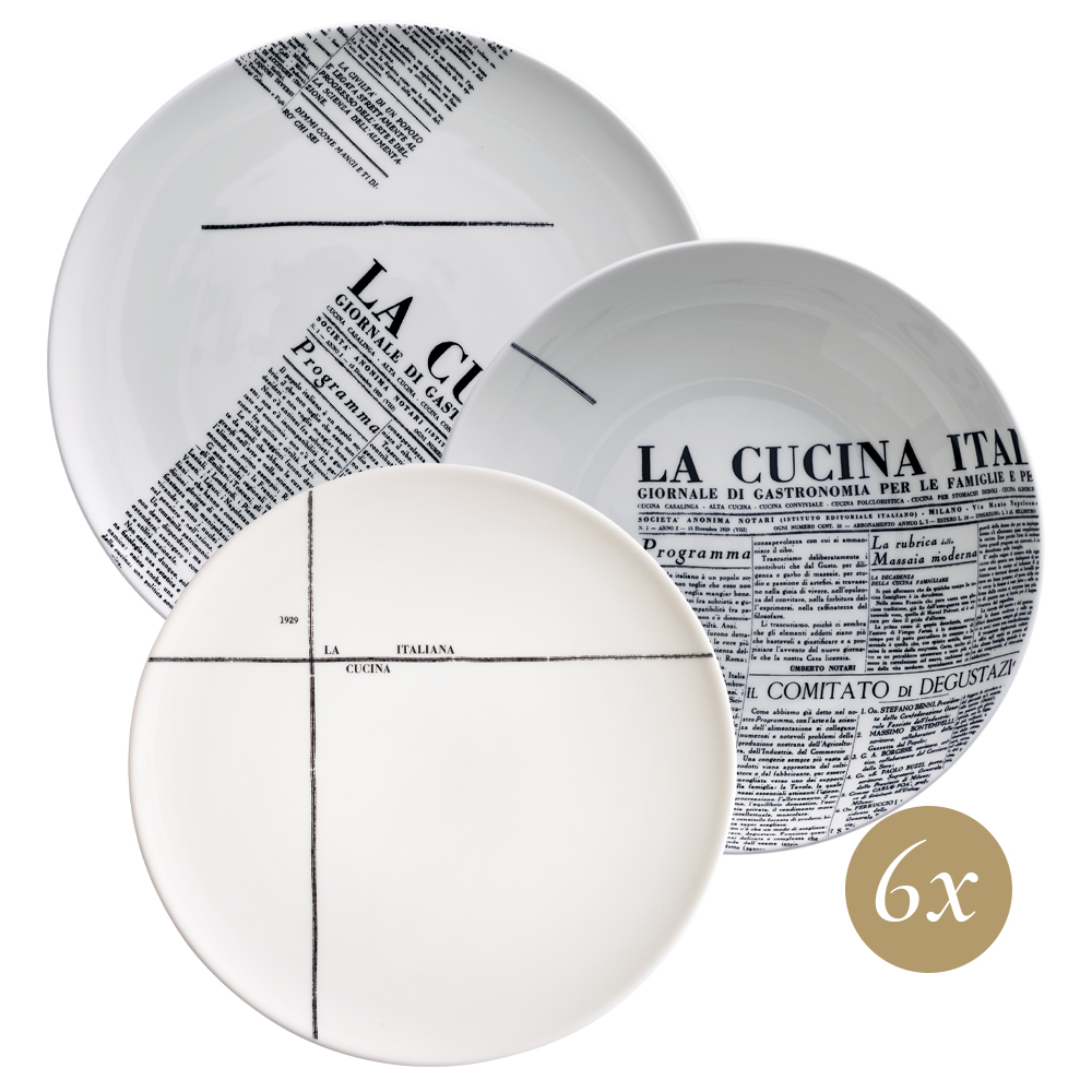 Set per 6 coperti dell linea Geometric, composto da 6 piatti piani, 6 fondi, 6 dessert, tutti in bone china con decori geometrici neri e scritte originali tratte dalla prima edizione del magazine. L'alternanza di linee dritte, pattern astratti e frammenti d'impaginato sulla superficie centrale e/o sulla falda dona a ogni pezzo uno stile unico ma coordinato: perfetto per chi cerca una tavola di design ispirata alla cultura storica italiana.