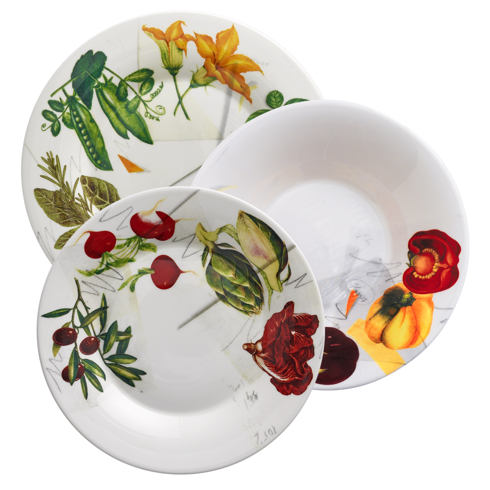 Un piccolo palcoscenico di graphic design italiano: questo set da 3 pezzi Vegan unisce piatto piano, fondo e dessert in una coreografia di collage colorati. Sulle superfici in bone china scorre una parata di ortaggi appena tagliati, appunti editoriali e tocchi di fantasia illustrata. Ogni pezzo è diverso, rendendo la mise en place vivace come una pagina di rivista pronta a raccontare una storia sempre nuova. Ideale per chi ama la cucina come creatività, la tavola come racconto e la convivialità come espressione di stile.
