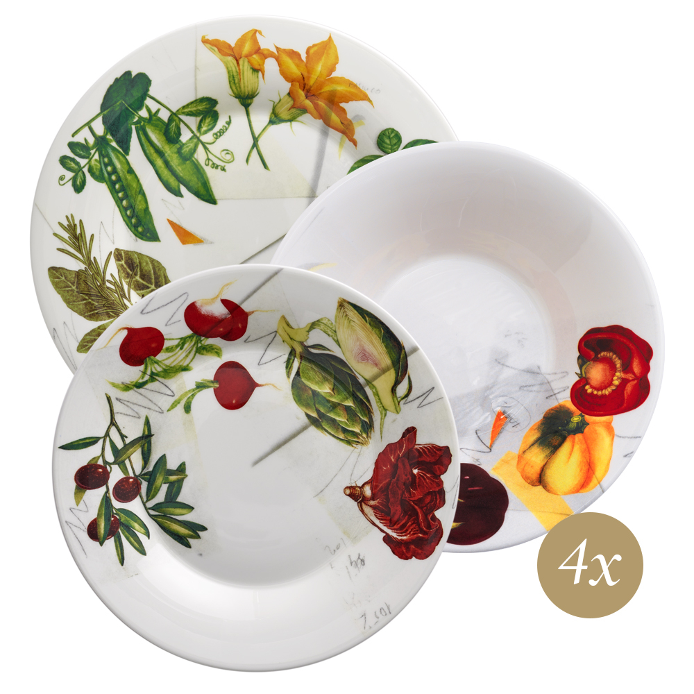 Dodici motivi per celebrare la gioia del food design, quattro coperti coordinati in bone china nel caos studiato di una redazione anni ?90, tra schizzi, verdure, post-it e piccoli dettagli che sembrano usciti dal taccuino di un illustratore. In ogni piatto di questo set Vintage schizzi colorati e ortaggi reali creano una mise en place imprevedibile e piena di sorprese, sempre diversa, sempre autentica. Un tributo pop e ironico alla vita di cucina, perfetto per tavole creative e aperte al dialogo.
