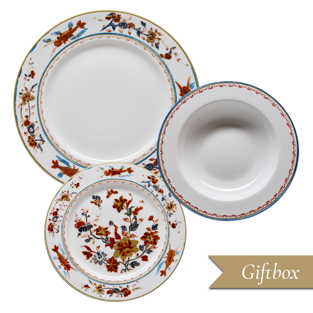 Uno scrigno di eleganza: il set 3 pezzi Chinesi Fiori Finiti in giftbox GCV racchiude icone in bone china illuminate da motivi Imari. Ogni pezzo narra visivamente il ponte tra Venezia e Oriente, con fiori e carpe Koi su bianco lucente e dettagli blu cobalto. La confezione raffinata e la firma del brand lo rendono una scelta regalo d'eccezione, ideale per chi ama la tradizione e vuole sorprendere con gusto senza tempo.