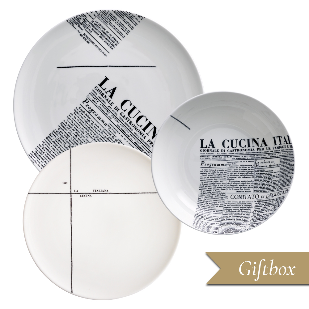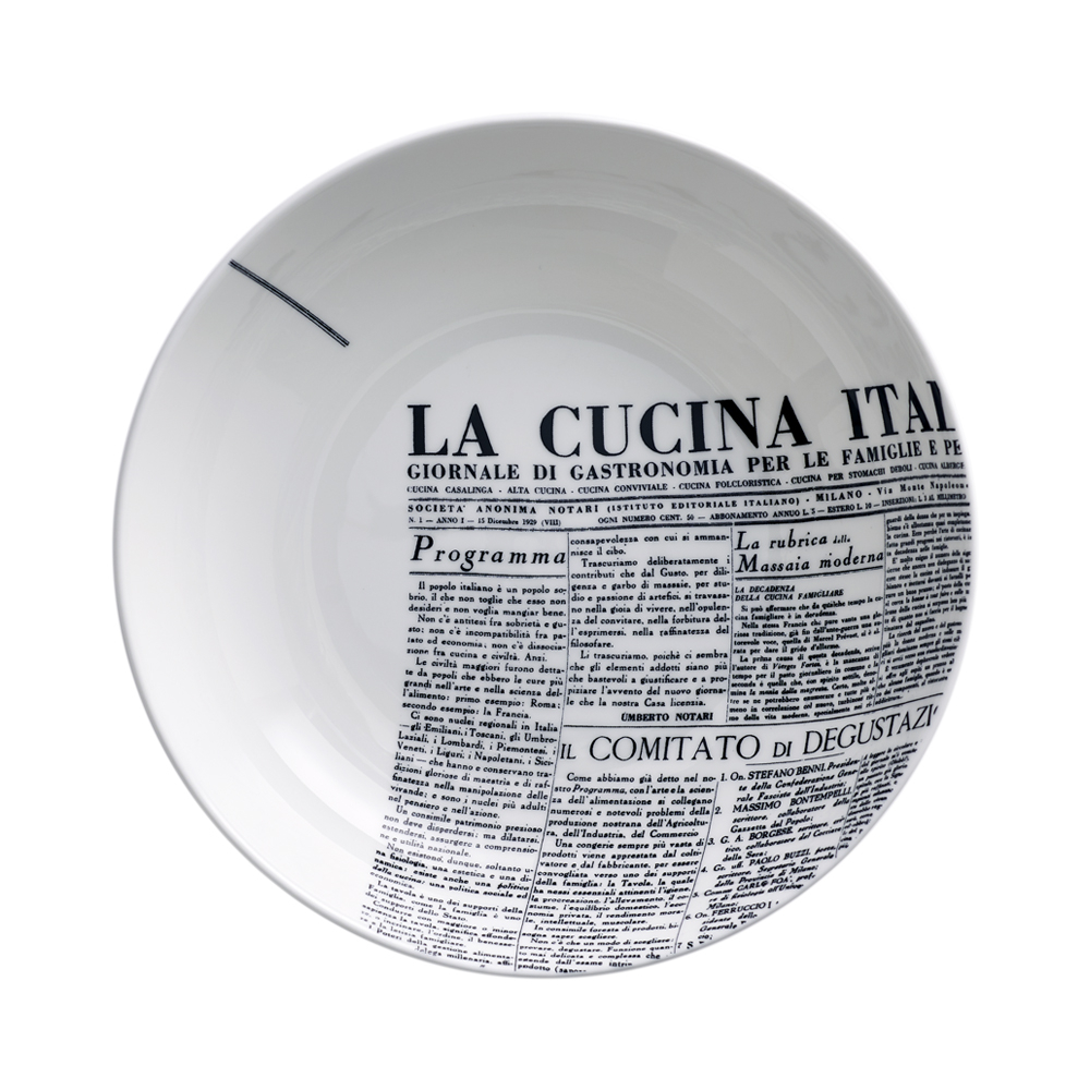Tre piatti racchiusi in una giftbox elegante, che sembrano usciti da una rivista d'arte grafica. Il set Geometric In bone china è pura architettura in miniatura: linee nere, geometrie razionaliste, frammenti tipografici e vere citazioni (?La Cucina Italiana? e la lista del Comitato di Degustazione 1929) si compongono come spartiti d'autore. Ogni formato, piano, fondo e dessert, è diverso ma armonico, pronto a fare della tavola un manifesto di design minimal ma colto, capace di sorprendere chiunque ami la cultura del dettaglio e la poesia della semplicità.