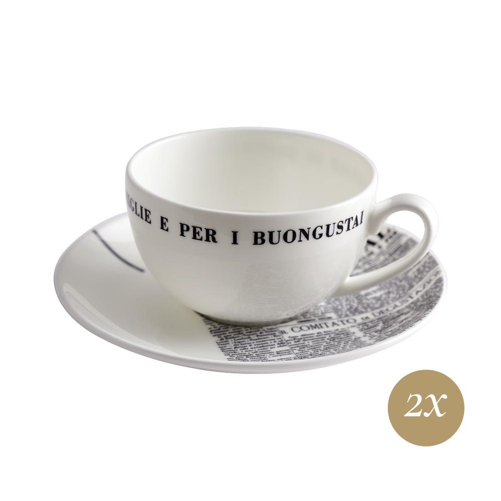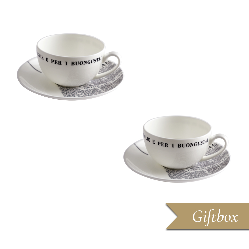 Due tazze tè/cappuccino e due piattini: la colazione si trasforma in una vera esperienza di design. Su ogni superficie, linee e blocchi neri ispirati alla grafica del 1929, scritte ?La Cucina Italiana? e dettagli redazionali si intrecciano con eleganza, abbracciando il bianco puro della bone china con una sensibilità minimal e poetica. Un set della linea Geometric, pensato per condividere storie, idee e la passione per il bello, dalla tavola di oggi alle atmosfere dei grandi artisti e giornalisti di ieri.