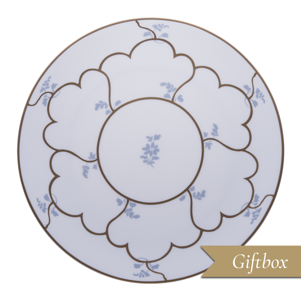 Il segnaposto da 33 cm della collezione Feston e Cadena Azzurro, proposto in elegante giftbox GCV, esalta la tavola formale con il suo decoro ?a ragnatela? dorata e dettagli di glicine blu su finissima bone china. Un capolavoro di equilibrio fra lusso sobrio e maestria artigianale, che sostiene con autorevolezza la sovrapposizione dei piatti. Firmato Geminiano Cozzi 1765, rappresenta il simbolo di ospitalità veneziana più autentica.