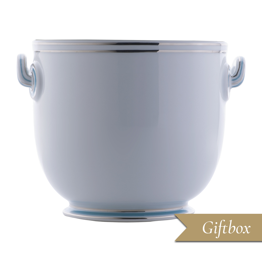 Ampio cache pot in porcellana, decorato con eleganti filetti platino e dettagli azzurri, racchiuso in una lussuosa giftbox Geminiano Cozzi. La forma generosa, ispirata ai grandi rinfrescatoi del Settecento veneziano, offre infinite possibilità d'uso: portavaso scenografico per fiori freschi o piante, glacette per bottiglie importanti, contenitore per frutta o protagonista di mise en place d'albergo e ambienti di rappresentanza. I motivi metallici e la superficie lucida riflettono luce e raffinatezza, rendendo questo oggetto il favorito in hotel di lusso, spa e ambienti contract dove eleganza e storia sono richieste.
