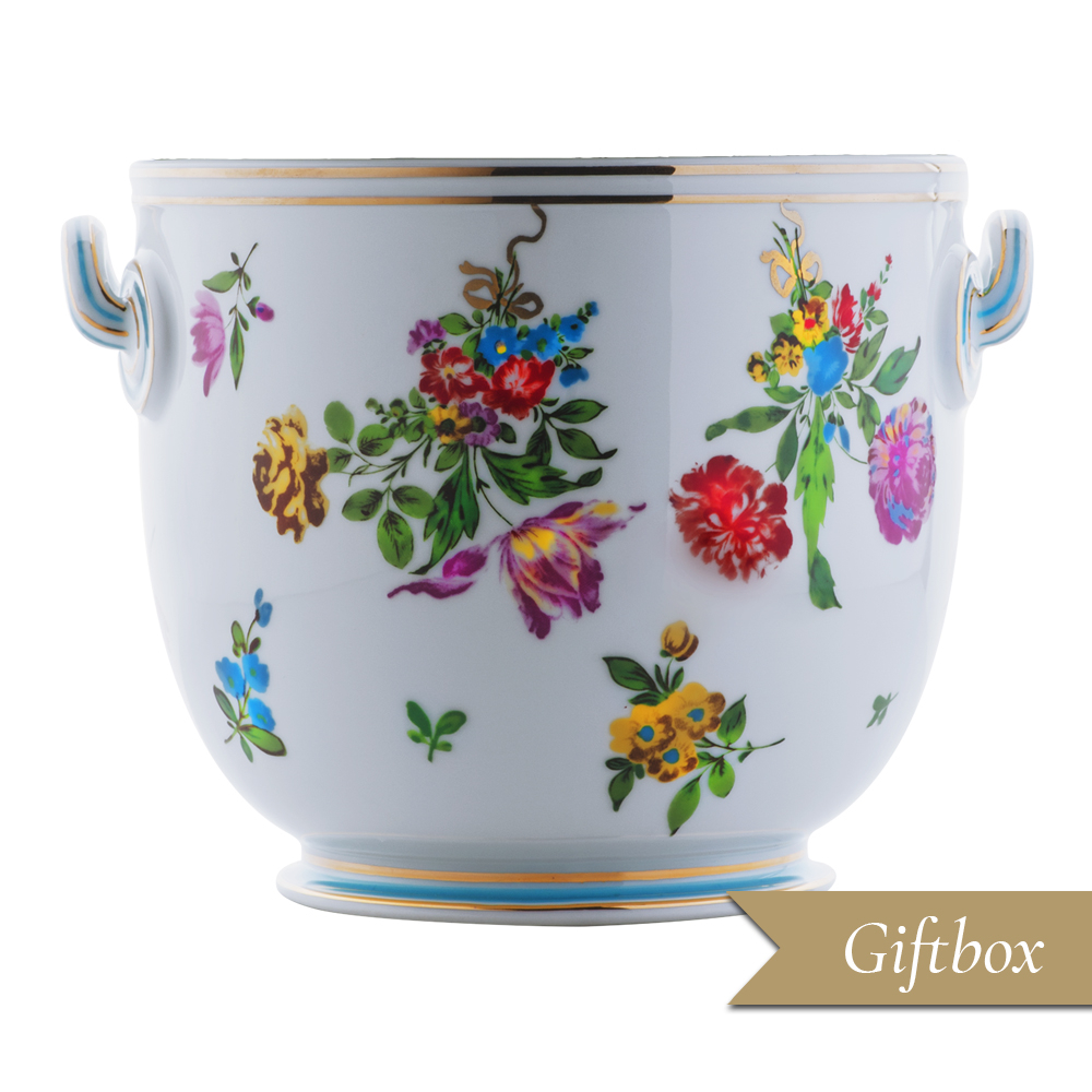 Questo rinfrescatoio racconta la gioia e la raffinatezza della tavola veneziana attraverso vitali bouquet floreali, che risaltano sui manici sagomati e sui profili dorati. Più di una glacette, è un mini-fioriere: ogni vaso, grazie alla sapienza pittorica degli artigiani Geminiano Cozzi, si trasforma in un piccolo giardino per ospitare fiori freschi, frutta o bottiglie nei buffet più esclusivi. Ampiamente apprezzato nell'hotellerie di lusso per la capacità di creare ambientazioni poetiche e senza tempo, celebra la storia, l'arte e il colore raffinato dell'ospitalità ad alto livello.