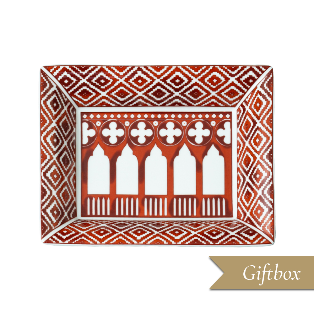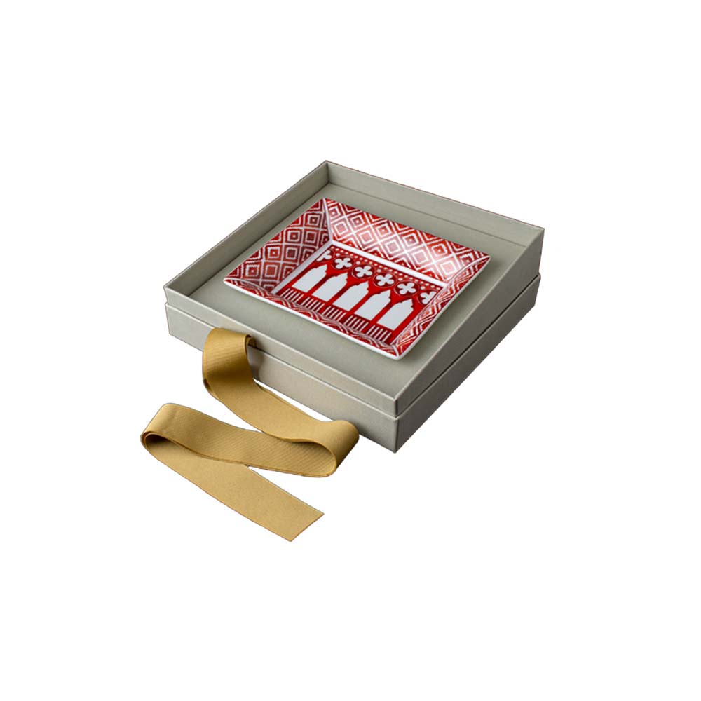 Svuotatasche rettangolare in porcellana, firmato Geminiano Cozzi Venezia 1765, proposto in elegante giftbox e ispirato alle ?loze?, le logge traforate e gli intrecci architettonici che impreziosiscono le facciate dei grandi palazzi veneziani. Il bordo inclinato è decorato con una trama geometrica regolare a rombi rossi su fondo bianco, vivace e raffinata, rievocando pavimentazioni storiche e fasce decorative tipiche della Serenissima. Il cuore del piatto, incorniciato magistralmente, mette in primo piano una sequenza di archi gotici e quadrilobi sovrastati da rosoni traforati, un chiaro omaggio alle finestre e alle logge dei palazzi come Ca' D'Oro e Palazzo Ducale. L'uso del rosso ferro come unico colore decorativo dona energia, eleganza e richiama il leitmotiv della collezione Venezia 1600, pensata per celebrare l'estetica, la storia e la funzione di crocevia di culture della città. Ideale come elegante vassoio da ingresso, porta-gioie, base per piccoli oggetti o piccola scenografia per la tavola. È anche una scelta distintiva per boutique hotel, suite o come raffinato cadeau che racconta, in chiave contemporanea, la memoria viva dell'ornato veneziano.