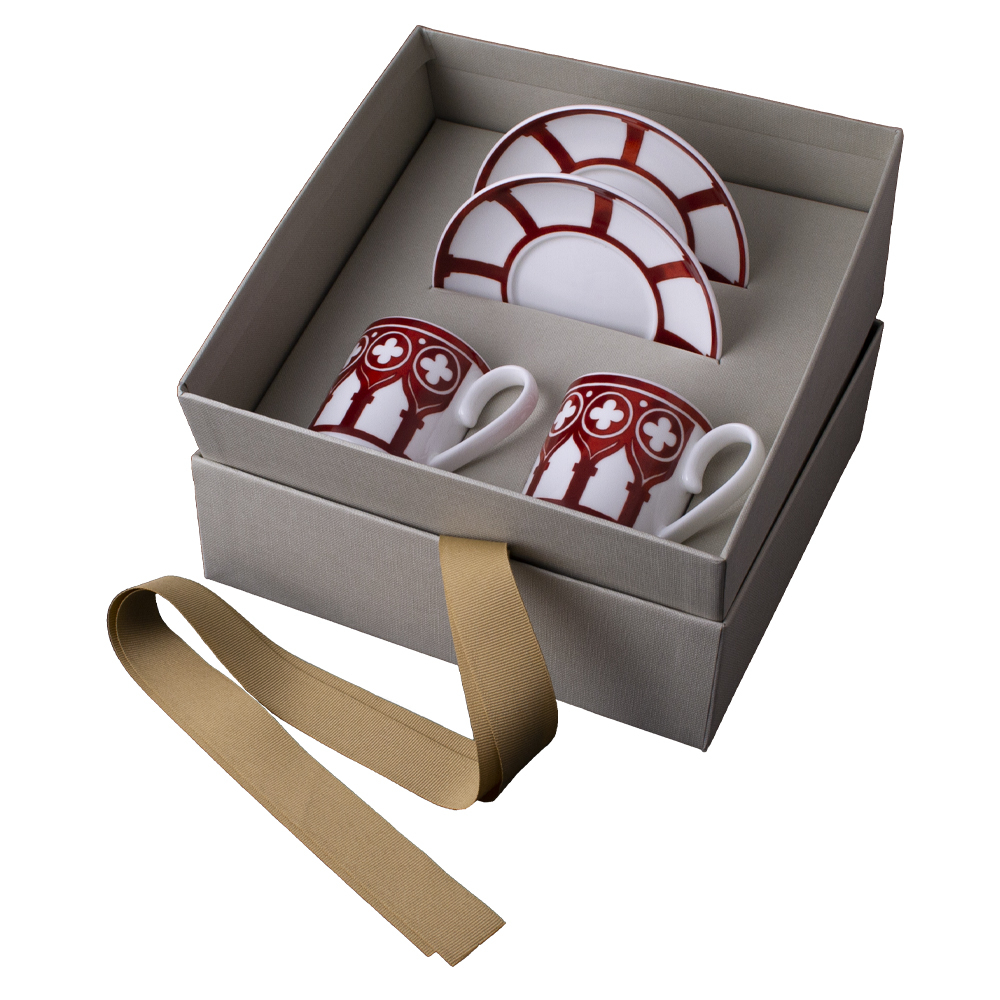 Il set caffè da 4 pezzi della linea Le loze dei bei palassi racchiude eleganza e memoria in una prestigiosa giftbox firmata Geminiano Cozzi Venezia 1765. Le tazzine e i piattini riprendono il motivo dominante della collezione: le logge gotiche veneziane, riprodotte nei particolari architettonici di archi, quadrilobi e cornici regolari, in un raffinato rosso ferro su bone china bianca. Il decoro avvolge ogni tazzina, mentre sui piattini la fascia geometrica evoca con precisione le trame delle balaustre e i giochi di luce che animano le facciate del Palazzo Ducale. Un set pensato per celebrare la convivialità con stile, ideale per doni esclusivi, per hospitality di lusso o come prezioso oggetto da collezione che racconta la storia e la cultura di Venezia attraverso ogni dettaglio dipinto.