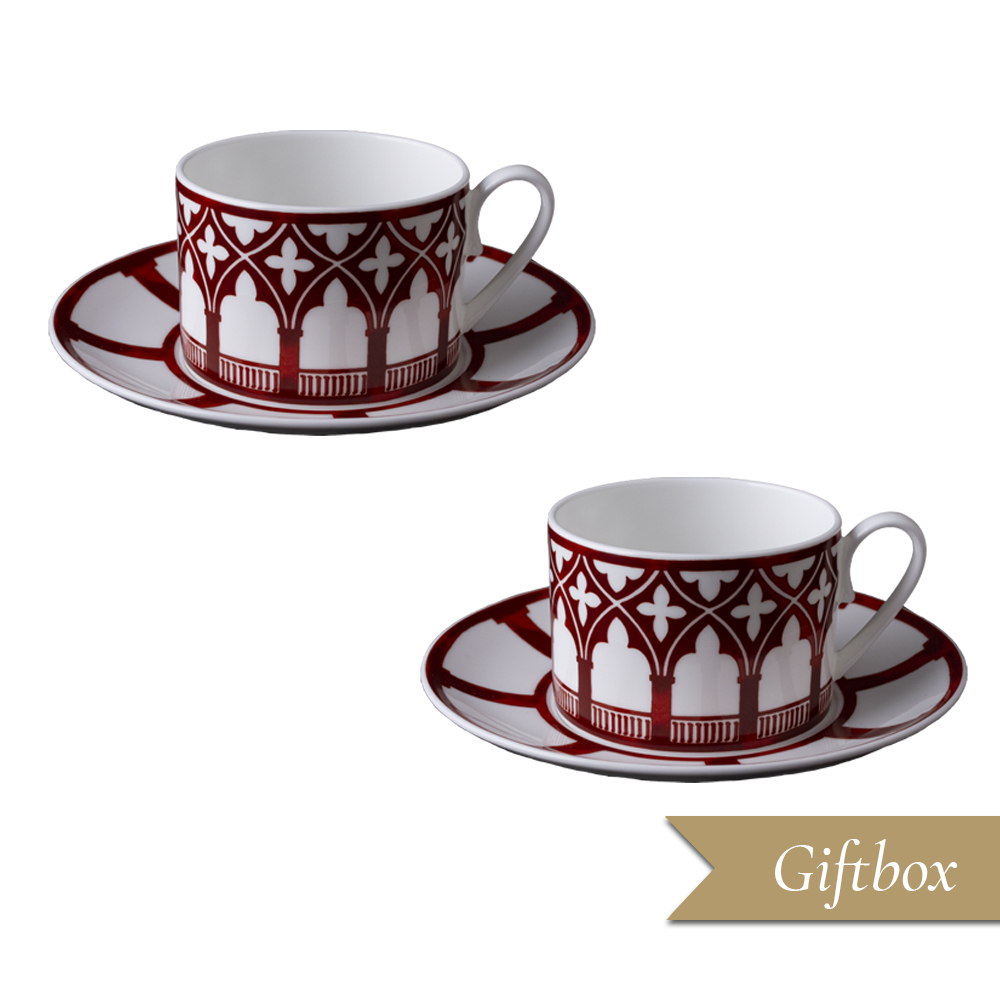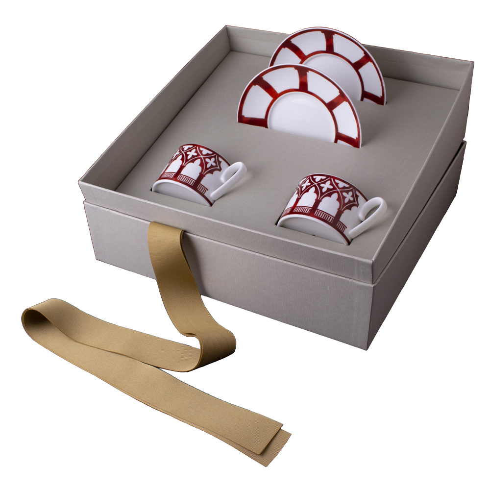 Quattro pezzi, due tazze tè e rispettivi piattini, della collezione Cà D'Oro, racchiusi in una giftbox di pregio, con decoro dedicato alle logge architettoniche che hanno reso Venezia un simbolo di raffinata bellezza nel mondo. Il pattern rosso ferro disegna una serie di arcate gotiche e cornici geometriche che si rincorrono lungo il bordo delle tazze e dei piattini, mentre il candore della bone china enfatizza il contrasto con i motivi ispirati alle ?loze? della Cà D'Oro. Ideale come set da regalo, complemento per servizi importanti o per arricchire l'accoglienza di suite alberghiere e ambienti luxury, celebra il 1600° anniversario di Venezia con arte e gusto contemporaneo.