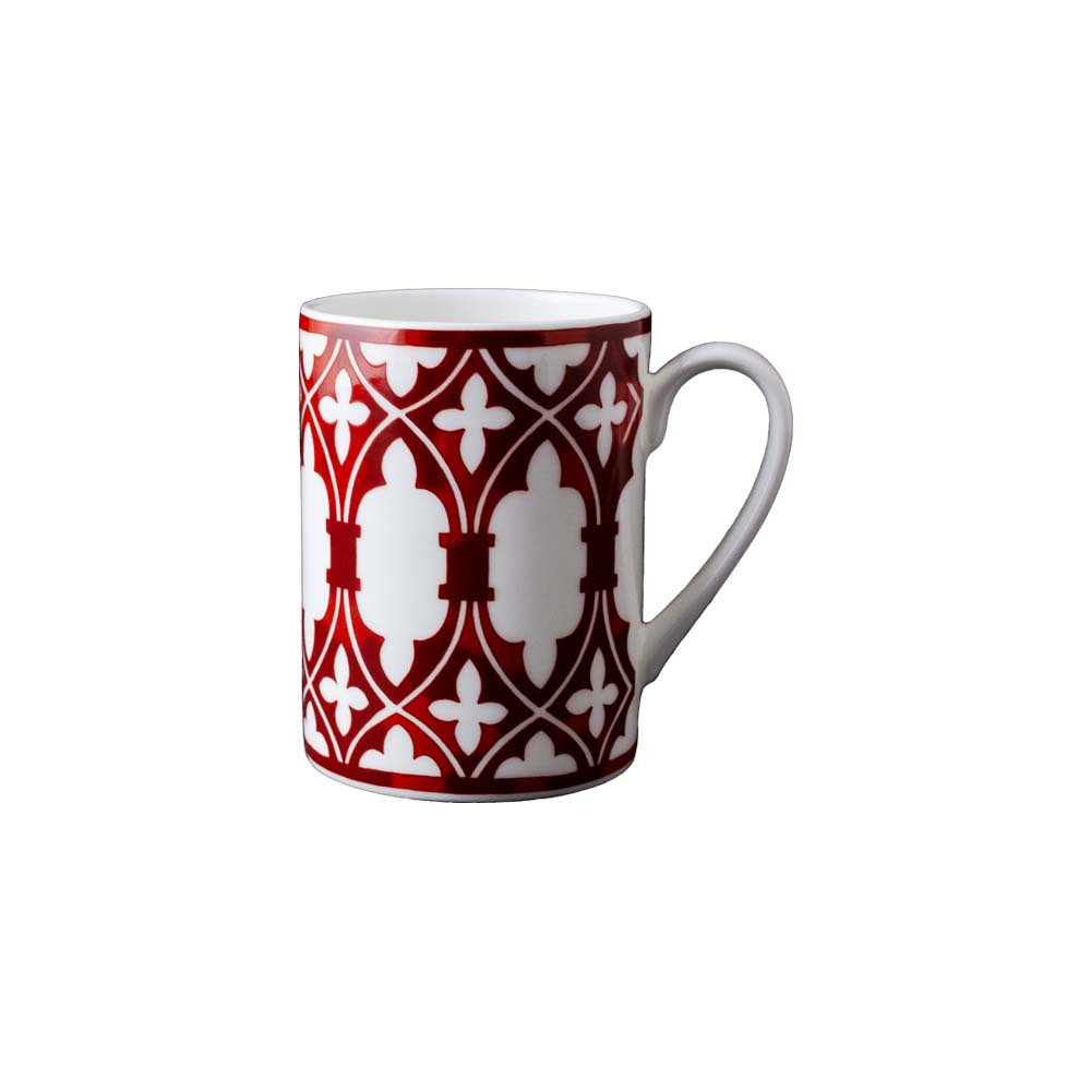 Mug capiente da 450cc in bone china Le loze dei bei palassi, perfetta sintesi tra funzionalità attuale e fascino storico. Il decoro principale reinterpreta il leitmotiv della collezione: una sequenza di logge, archi e rombi stilizzati in rosso ferro, ispirati alle finestre e ai fregi che impreziosiscono i prospetti della Cà D'Oro. Il disegno, elegante e grafico, si sviluppa sia orizzontalmente che verticalmente sulla superficie del mug, regalando una scenografia architettonica unica a ogni pausa caffè, tè o tisana. La generosa capacità lo rende perfetto sia per l'uso domestico che per l'accoglienza sofisticata in boutique hotel e suite di prestigio. Stile, praticità ed evocazione storica si fondono in un oggetto che narra la Venezia dei palazzi e delle logge, facendo ogni sorso un viaggio nella storia della Serenissima.