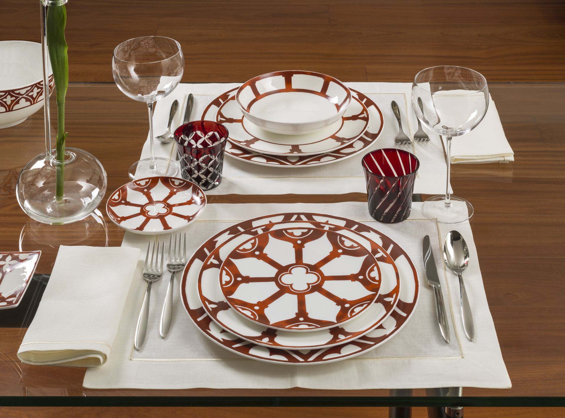 Il piatto dessert da 22 cm, della linea Palazzo Ducale, reinterpreta la magia delle logge veneziane con raffinati archi gotici, quadrilobi e motivi a rombo in rosso ferro, che percorrono il bordo su fondo di bone china bianca. Il decoro, ritmato e grafico, ricorda le pavimentazioni e le balaustre che ornano gli ingressi dei ?bei palassi?. Ideale per servire dolci, frutta o piccoli antipasti, dona prestigio alla mise en place in contesti di ristorazione esclusiva, eventi speciali e colazioni d'hotel. Un elemento distintivo che porta a tavola la forza e la leggerezza dell'ornato veneziano tramandato nei secoli.