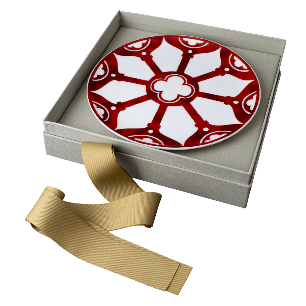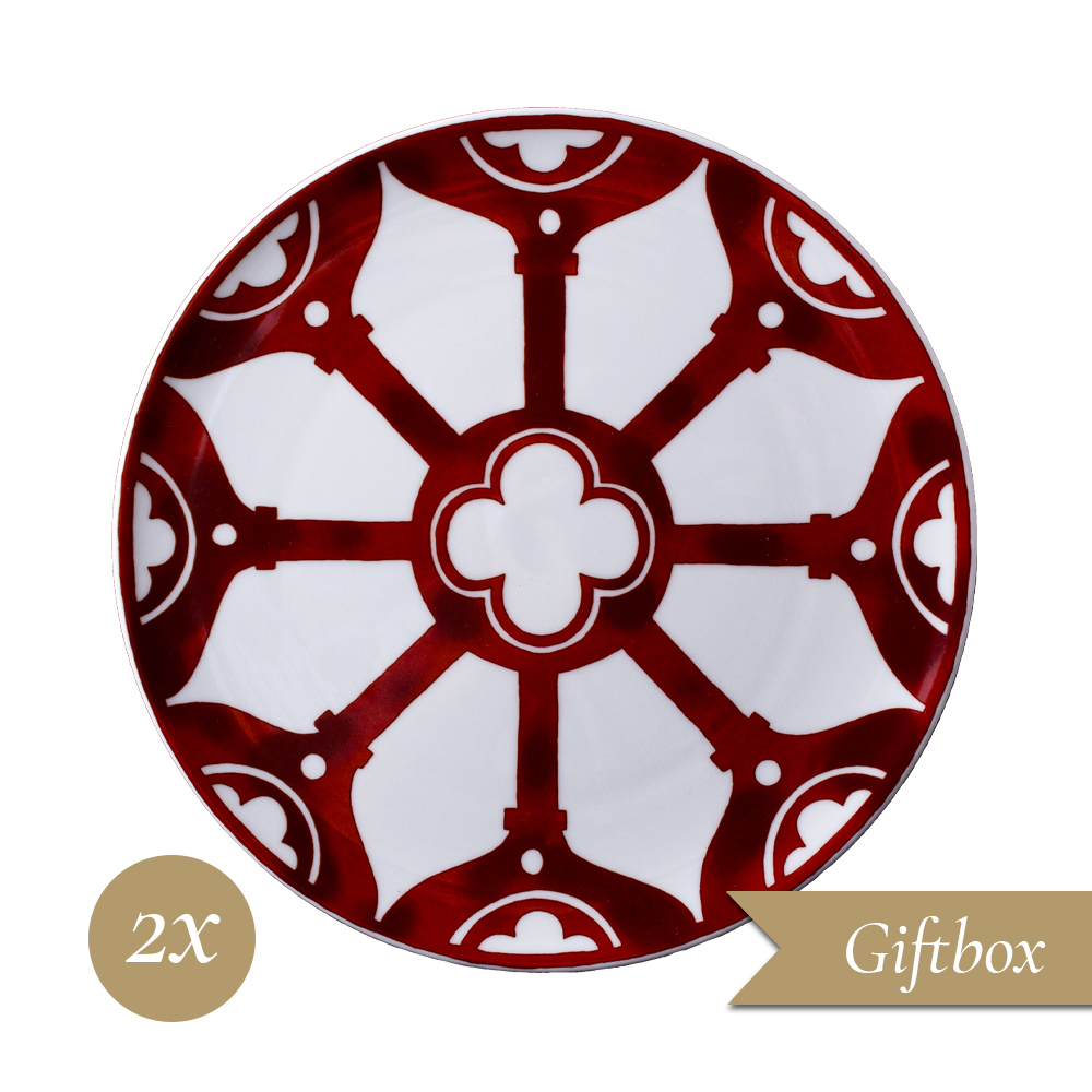 Questo cofanetto della collezione Palazzo Ducale contiene due piatti da dessert, ciascuno decorato sui bordi con i motivi gotici della collezione Venezia 1600. Il rosso ferro, vivace e intenso, si intreccia lungo l'anello esterno, mentre la superficie rimane pulita ed elegante per valorizzare la presentazione di dolci o frutta. La giftbox rende il set perfetto come regalo raffinato per chi ama la cultura veneziana o come accessorio di classe per cene e ricevimenti speciali in hotellerie. Il decoro, preciso e armonioso, racchiude la stessa poesia dei loggiati antichi, elevando ogni momento conviviale.