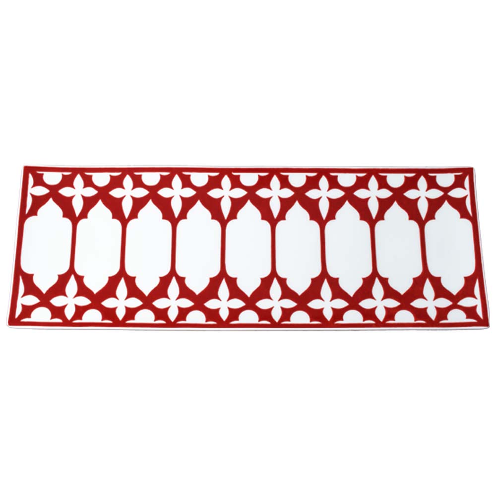 Questo vassoio rettangolare da 35 cm Cà D'Oro, in bone china candida e luminosa, accoglie lungo i bordi il decoro più iconico della collezione: una teoria di archi, logge e moduli geometrici rossi che rimandano immediatamente alle finestre traforate dei palazzi veneziani. Il motivo, netto ed elegante, incornicia la superficie centrale lasciandola pronta ad accogliere petit-four, dolci, canapés o come base scenografica per ogni servizio d'eccellenza. Perfetto per buffet di hotel, banchetti, ricevimenti o come oggetto d'arredo raffinato in casa e hospitality.