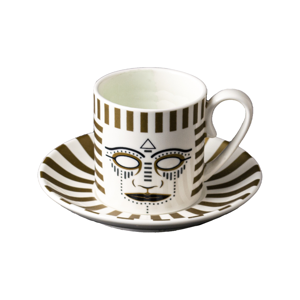 La tazza caffè Pi-Atum della collezione Ethnics di Geminiano Cozzi incarna il viaggio tra culture ancestrali e design contemporaneo. Realizzata in raffinata porcellana, è impreziosita da un decoro che richiama le maschere rituali dell'antico Egitto e delle civiltà precolombiane, simboli di spiritualità e identità. Il piattino coordinato racconta, attraverso linee e cromie audaci, un intreccio di storie senza tempo. Ogni sorso d'espresso diventa così un rito di connessione con mondi lontani, celebrando la pluralità culturale e la bellezza delle differenze.