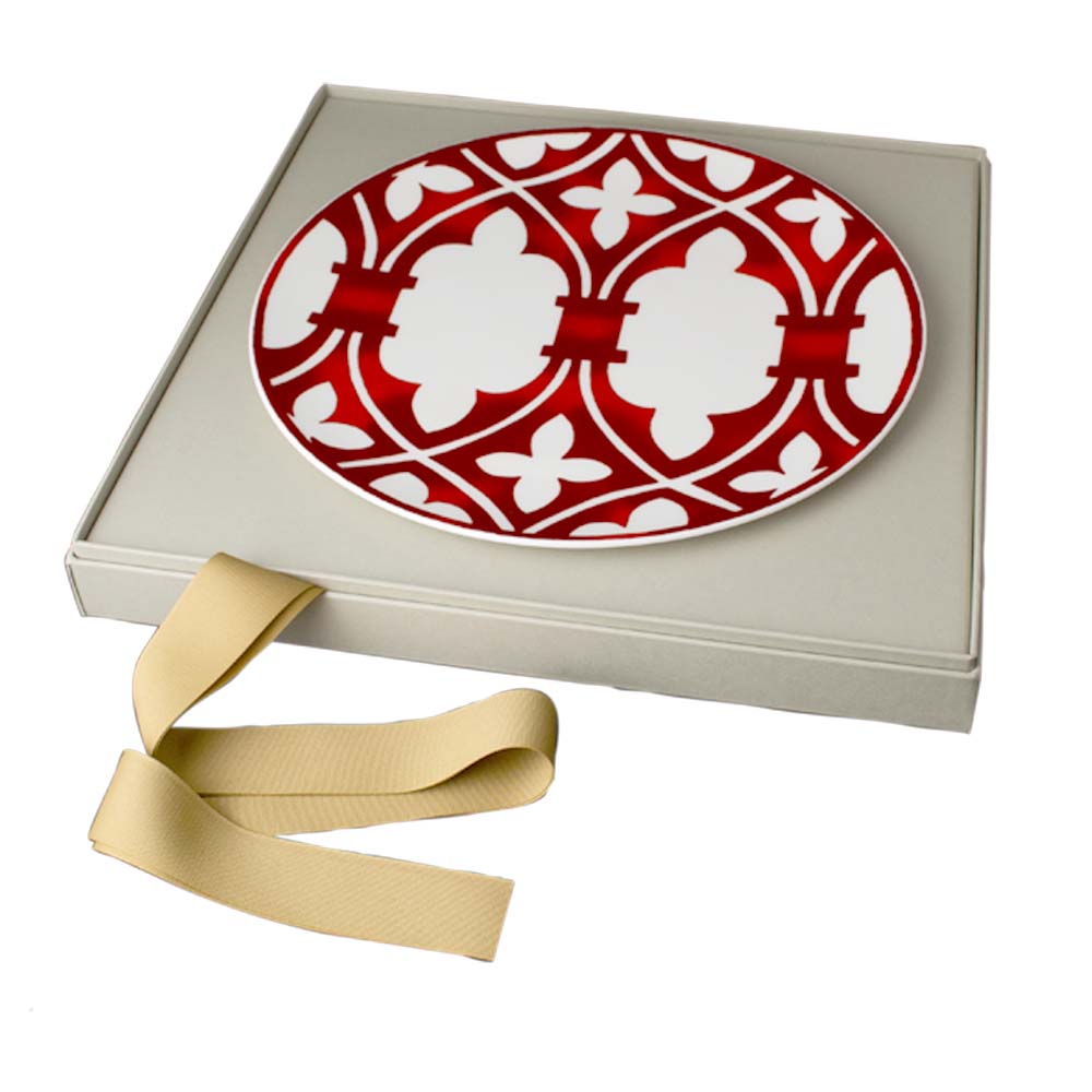 Il segnaposto da 33cm della collezione Venezia 1600 è una vera icona di eleganza celebrativa, pensata per rendere unica ogni tavola importante. Realizzato in raffinata bone china, presenta un decoro esclusivo in rosso ferro ispirato alle architetture e ai suggestivi motivi della Cà D'Oro. Il suo formato generoso ne fa il protagonista della mise en place: ideale come piatto segnaposto per eventi, matrimoni e ricevimenti di pregio, ma perfetto anche come centrotavola. Racchiude tutto il fascino di Venezia come crocevia di culture e custode di raffinata bellezza senza tempo, trasmettendo alla tavola il calore di una storia millenaria.