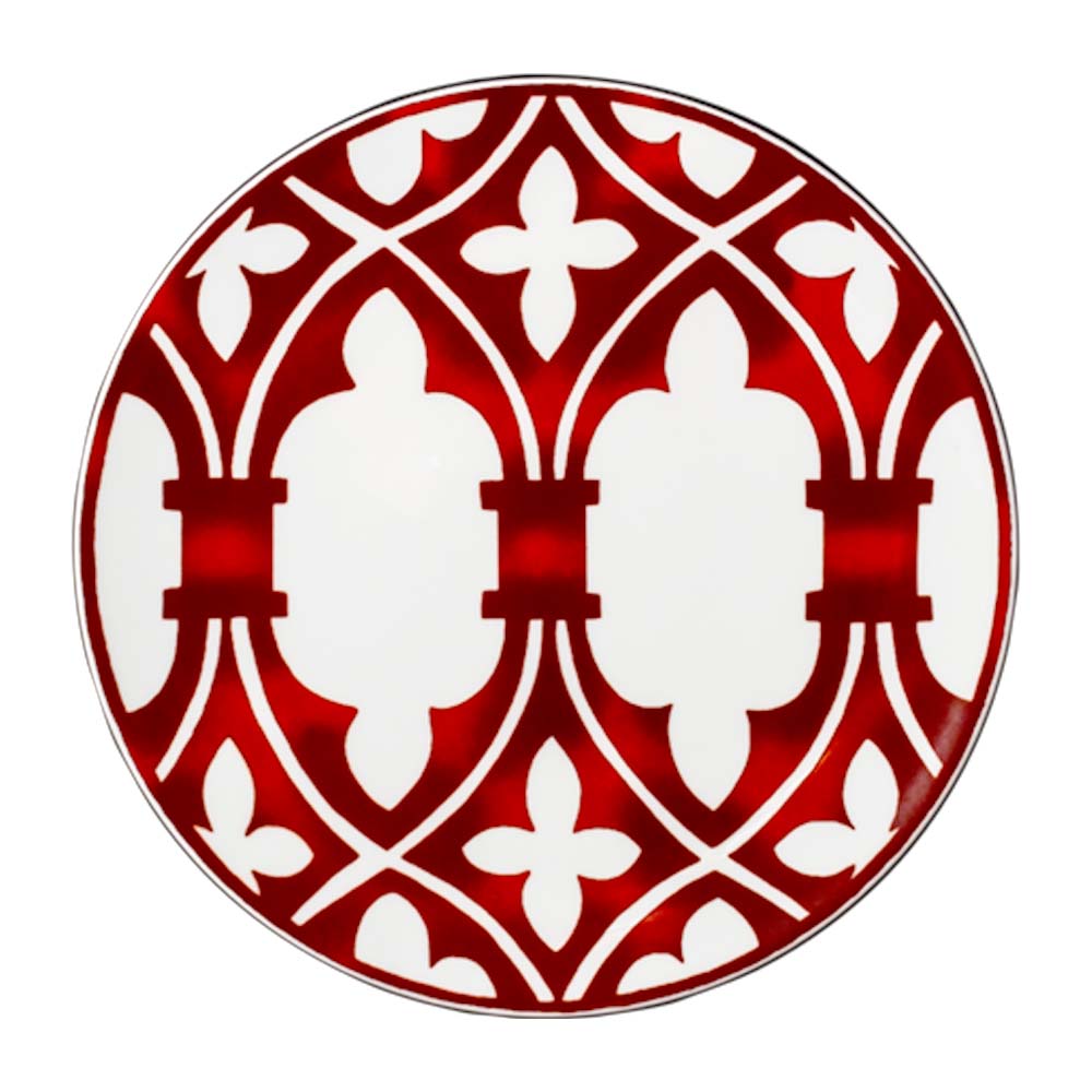 Il piattino pane e burro da 15cm è un gioiello che arricchisce ogni servizio. Sulla bone china bianca spiccano i decori in rosso ferro, reminiscenza delle magnifiche trame di balconi e logge veneziane, custodi di tradizione e apertura culturale. Pratico e raffinato, accompagna degustazioni, entrée e piccoli dessert aggiungendo un dettaglio di stile e storia a ogni occasione: dalla colazione in boutique hotel ai ricevimenti privati, è un piccolo segno di quel dialogo continuo tra Oriente e Occidente che da sempre distingue la Serenissima.