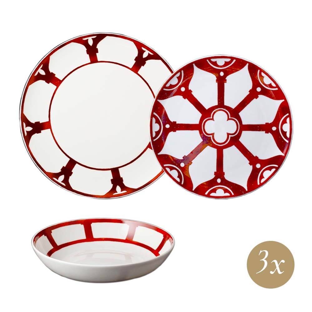 Il set tavola da 3 pezzi della collezione Venezia 1600 riunisce piatto piano, fondo e dessert in un raffinato racconto di arte, cultura e tradizione veneziana. Ogni elemento, lavorato in bone china di alta qualità e arricchito dal decoro rosso ferro, celebra la fondazione di Venezia come luogo d'incontro tra mondi, creatività e suggestioni stilistiche uniche. Ideale per vestire la tavola di casa con un tocco di storia millenaria o per offrire un servizio inconfondibile in hotel di lusso e ristoranti prestigiosi. Un set dal valore simbolico ed estetico, capace di continuare a ispirare e passare il testimone culturale di Venezia da una generazione all'altra.