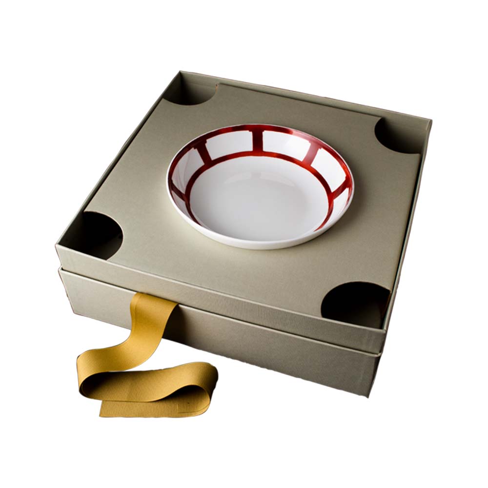 Il piattino pane e burro da 15cm è un gioiello che arricchisce ogni servizio. Sulla bone china bianca spiccano i decori in rosso ferro, reminiscenza delle magnifiche trame di balconi e logge veneziane, custodi di tradizione e apertura culturale. Pratico e raffinato, accompagna degustazioni, entrée e piccoli dessert aggiungendo un dettaglio di stile e storia a ogni occasione: dalla colazione in boutique hotel ai ricevimenti privati, è un piccolo segno di quel dialogo continuo tra Oriente e Occidente che da sempre distingue la Serenissima.