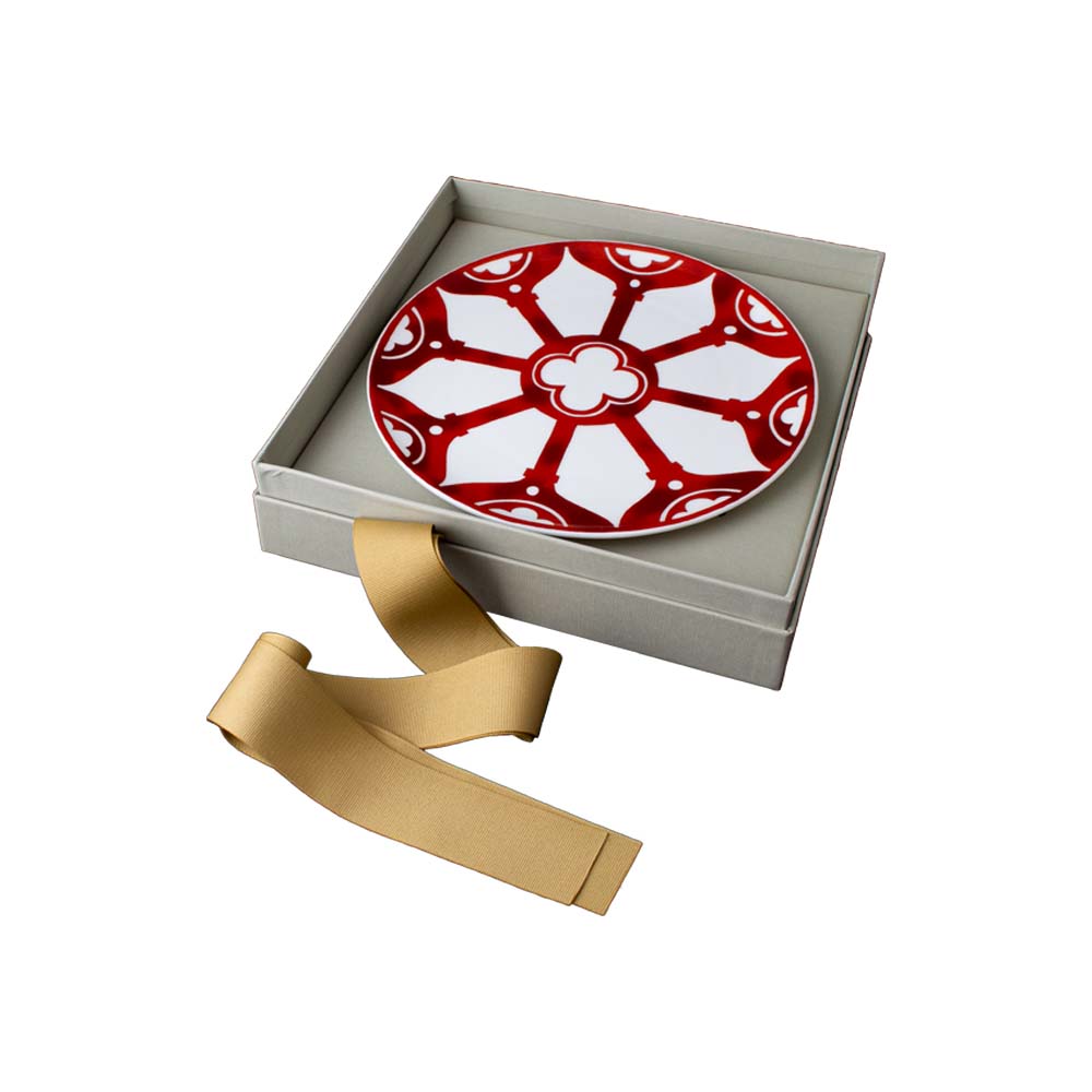 Questo cofanetto della collezione Palazzo Ducale contiene due piatti da dessert, ciascuno decorato sui bordi con i motivi gotici della collezione Venezia 1600. Il rosso ferro, vivace e intenso, si intreccia lungo l'anello esterno, mentre la superficie rimane pulita ed elegante per valorizzare la presentazione di dolci o frutta. La giftbox rende il set perfetto come regalo raffinato per chi ama la cultura veneziana o come accessorio di classe per cene e ricevimenti speciali in hotellerie. Il decoro, preciso e armonioso, racchiude la stessa poesia dei loggiati antichi, elevando ogni momento conviviale.