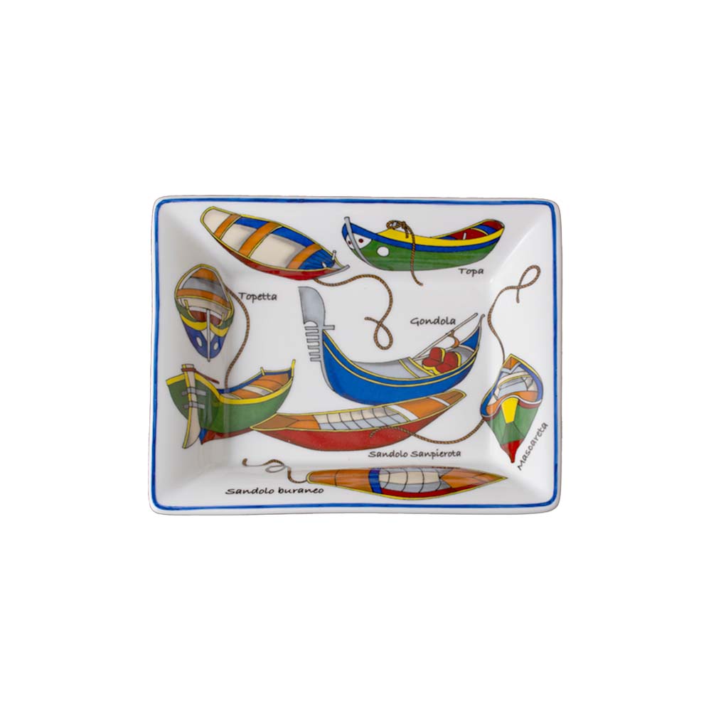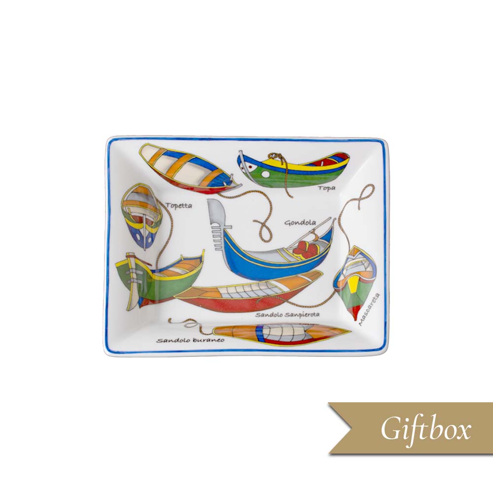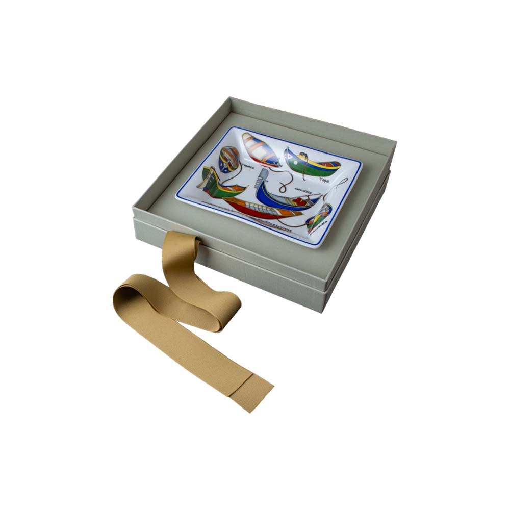 Questo svuotatasche in porcellana dalla forma rettangolare (19,5 x 16 cm) cattura subito lo sguardo con un vivace decoro ispirato ai motivi architettonici della Venezia rinascimentale. Sul fondo bianco, una composizione di piccoli battelli colorati solca la superficie tra sinuosità di corde e dettagli stilizzati: è un omaggio poetico alle barche storiche della laguna, gondole, sandoli, topette e altre tipicità veneziane, ognuna sapientemente illustrata e corredata da una scritta che ne indica la tipologia. La cornice sottile azzurra definisce il profilo del piatto, accentuando la luminosità della porcellana e donando al contorno una freschezza raffinata. La combinazione di colori decisi, rossi, verdi, blu, gialli, richiama la vitalità senza tempo del Carnevale, delle regate e dei vivaci scorci della città d'acqua. Racchiuso in un'elegante giftbox, questo svuotatasche diventa un regalo raffinato, perfetto come oggetto da ingresso, centrotavola creativo, vassoio per piccoli dolci o portaoggetti in ambienti domestici e di hotellerie.