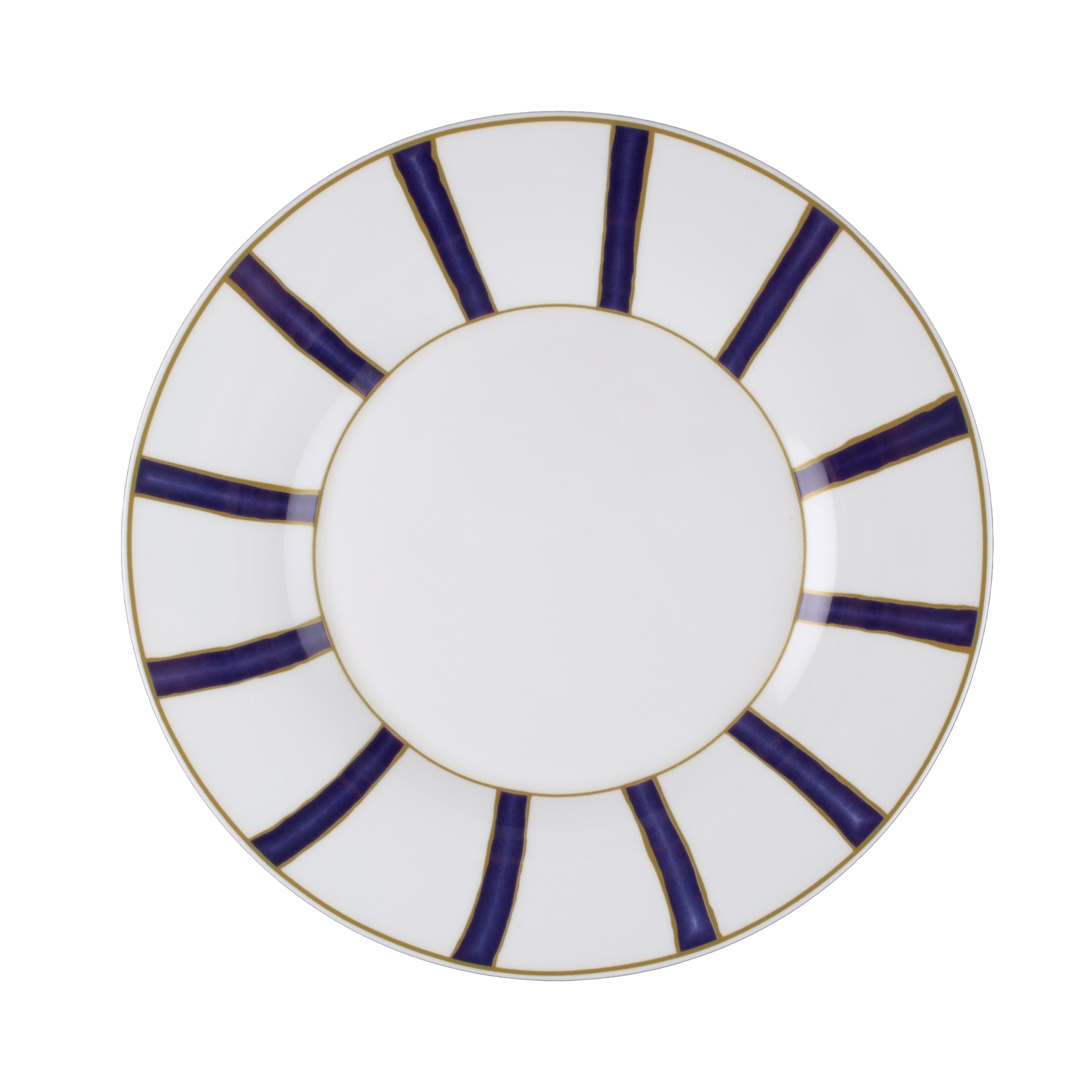 Il piatto piano 28cm Striche Blu e Oro è l'emblema della classicità reinterpretata: su fondo bianco in bone china di altissima qualità, una sequenza di raggi blu profondi si alterna con precisione a spazi bianchi, ognuno definito e valorizzato da un filo dorato che sottolinea la costruzione geometrica e la delicatezza artigianale. Questa decorazione settecentesca, storicamente audace per il blu dominante, restituisce carattere e prestigio a ogni portata principale, traendo ispirazione diretta dagli archivi Cozzi e dalla grande tradizione veneziana.