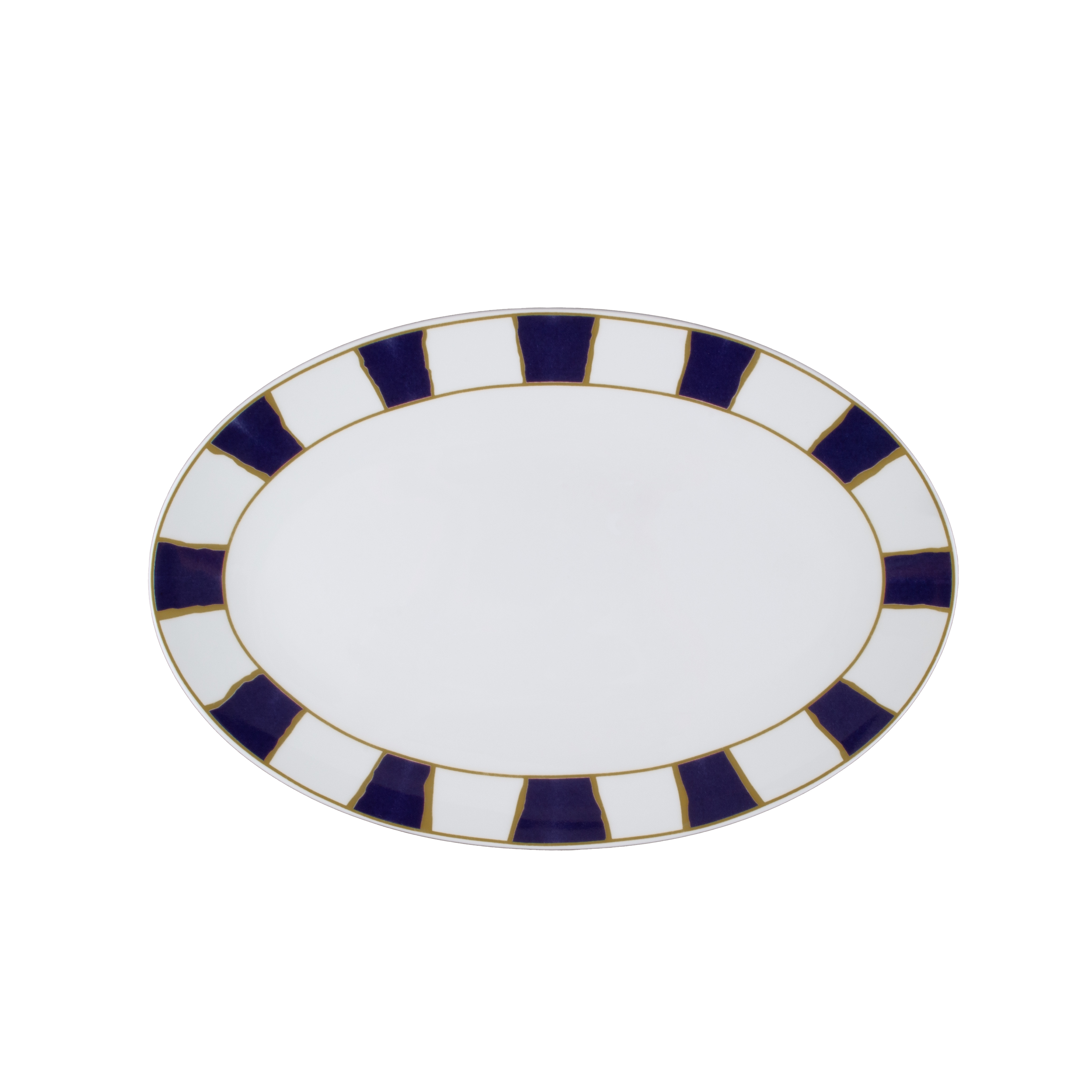 Il piatto ovale 26 cm Striche Blu e Oro racchiude l'essenza della decorazione grafica storica Cozzi: sul bordo in pregiata bone china si alternano settori blu intensi e spazi bianchi, tutti scanditi e impreziositi da sottili filetti dorati applicati a mano. Questo motivo ritmico, raffinato e luminoso, crea una cornice dinamica e sofisticata attorno al centro bianco, valorizzando antipasti, contorni e presentazioni speciali. Un simbolo di stile che fonde tradizione e attualità in ogni mise en place.