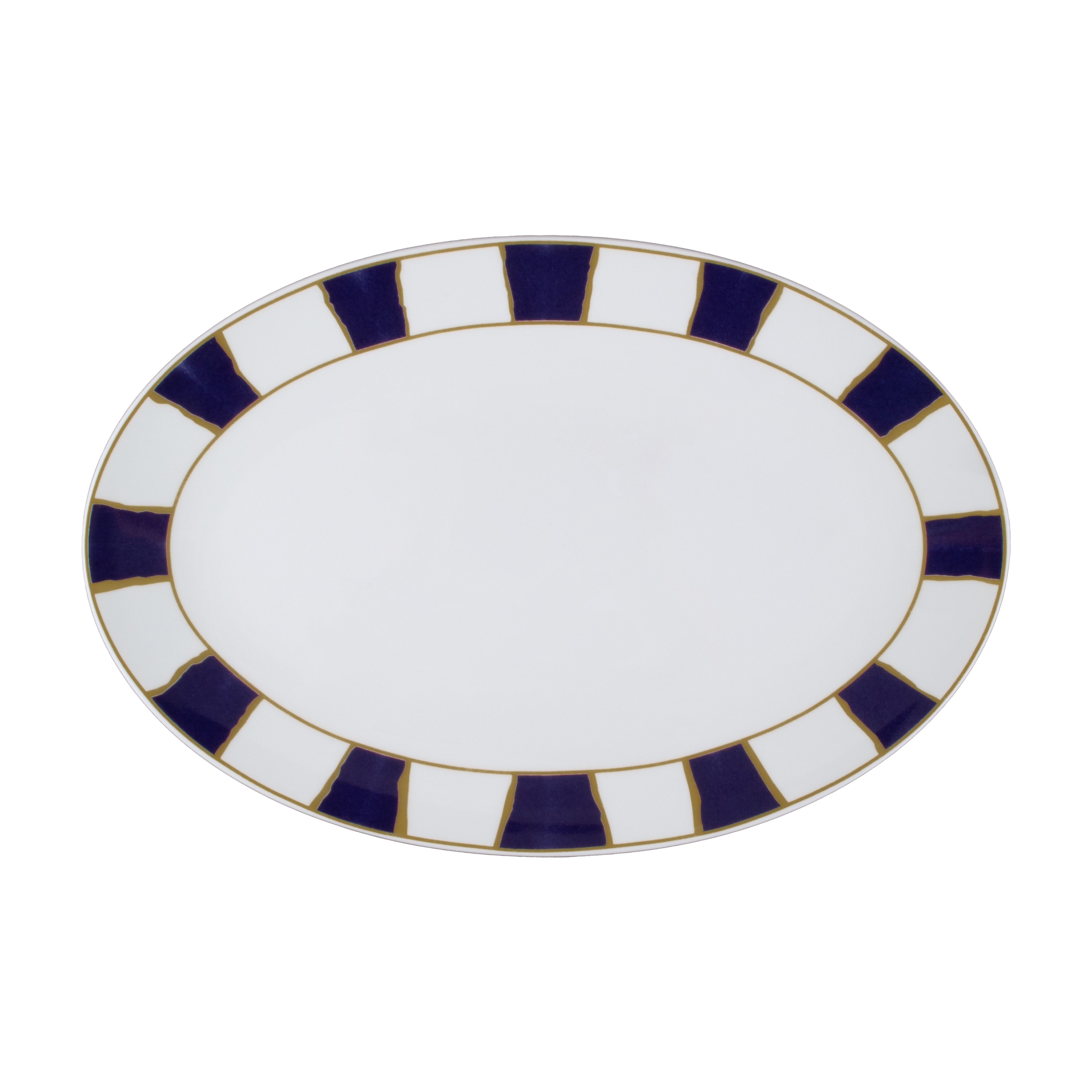 Il piatto ovale 32 cm Striche Blu e Oro è la perfetta sintesi di prestigio e design. Lungo il bordo in pregiata bone china, si alternano fasce blu e settori bianchi, ognuno separato e valorizzato da sottili filetti dorati applicati a mano. Questa composizione geometrica, dallo stile ritmico e luminoso, dona movimento ed eleganza alla forma ovale, creando la cornice ideale per portate principali scenografiche e di alta classe. Una celebrazione dell'estetica Cozzi che unisce la storia veneziana con la modernità decorativa.