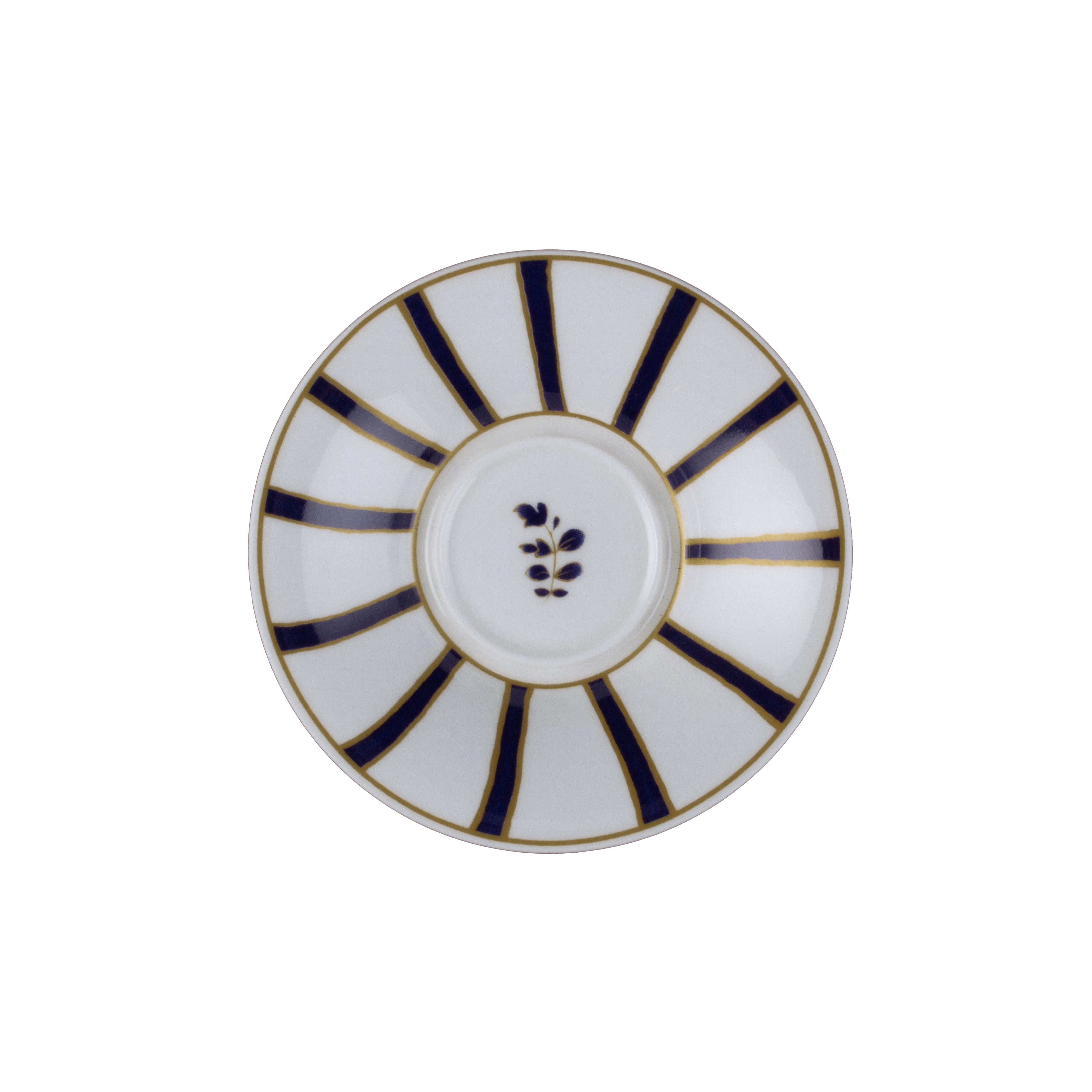 Il piattino da caffè Striche Blu e Oro da 12cm esprime la brillantezza dell'arte Cozzi, legando maestria storica e funzione contemporanea. In fine bone china, presenta un decoro radiale: fasce blu si alternano a spazi bianchi e sono separate da sottili filetti dorati applicati a mano, donando ritmo e luminosità all'insieme. Al centro, un elegante dettaglio floreale blu aggiunge personalità e tradizione, impreziosendo la pausa caffè con un tocco poetico e riconoscibile. Questo piattino non è solo abbinamento perfetto per la tazzina coordinata, ma anche un piccolo oggetto d'autore per chi ama portare sulla tavola la bellezza storica veneziana in chiave raffinata.