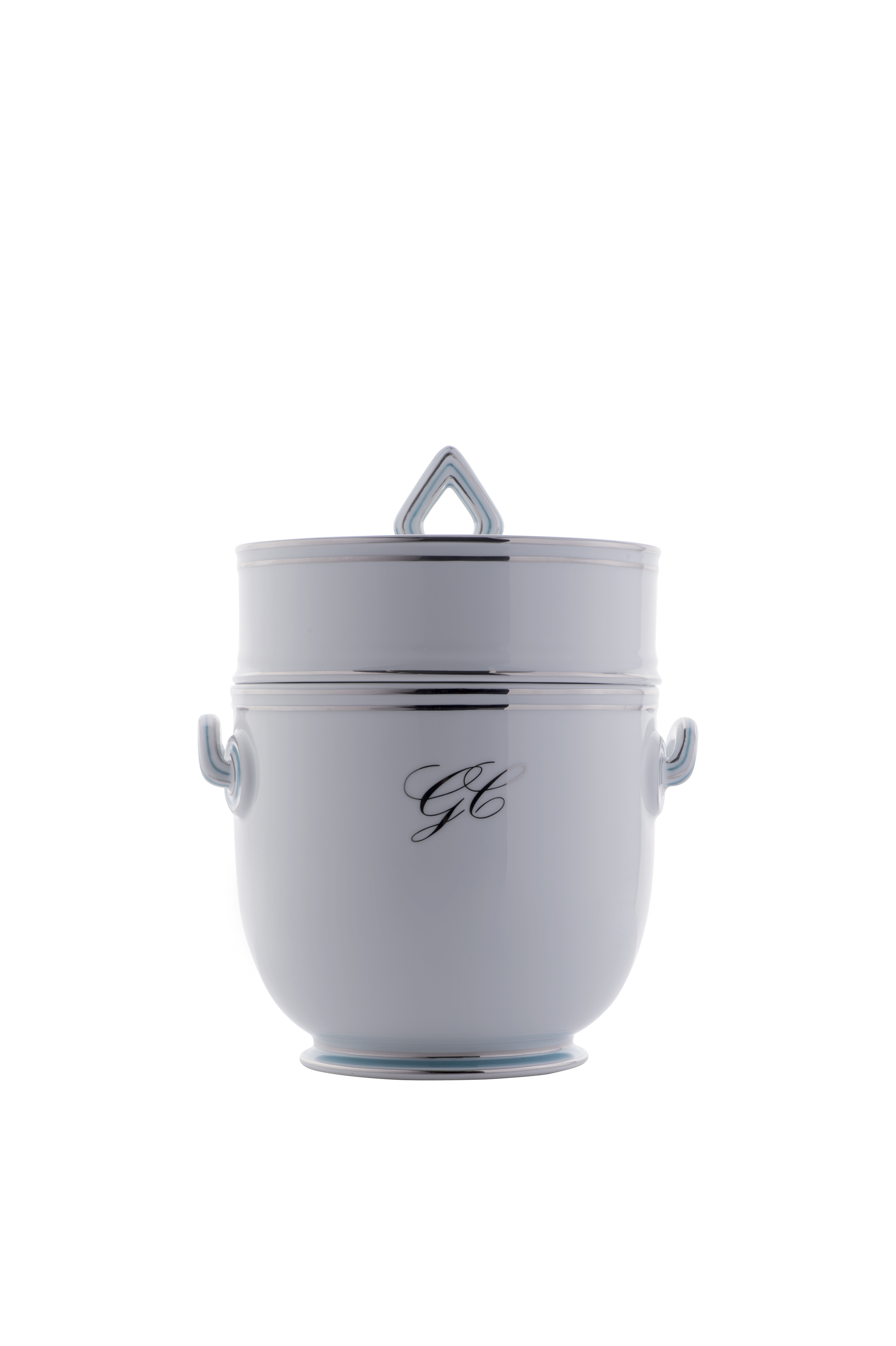Personalizzazione e raffinata esclusività per questo rinfrescatoio con fili in platino e motivi azzurri, arricchita da un monogramma su un lato del vaso. Perfetto per doni di rappresentanza, celebrazioni speciali o committenti privati che desiderano un oggetto unico, il monogramma viene realizzato su richiesta e aggiunge un valore affettivo e identitario. Uniscono la purezza della porcellana, la brillantezza del platino, la freschezza dell'azzurro e il tocco personale della firma: tradizione e individualità nell'essenza della manifattura veneziana.