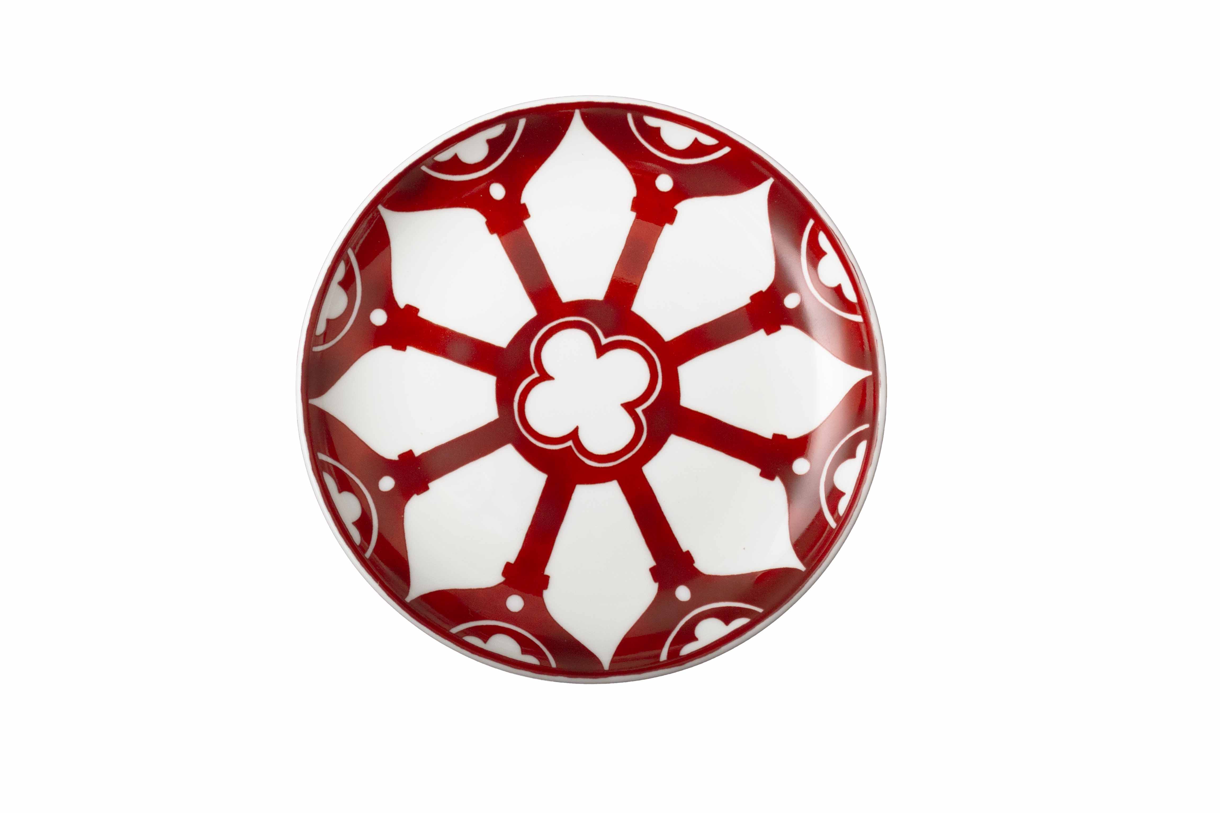 Il piattino pane e burro da 15cm è un gioiello che arricchisce ogni servizio. Sulla bone china bianca spiccano i decori in rosso ferro, reminiscenza delle magnifiche trame di balconi e logge veneziane, custodi di tradizione e apertura culturale. Pratico e raffinato, accompagna degustazioni, entrée e piccoli dessert aggiungendo un dettaglio di stile e storia a ogni occasione: dalla colazione in boutique hotel ai ricevimenti privati, è un piccolo segno di quel dialogo continuo tra Oriente e Occidente che da sempre distingue la Serenissima.