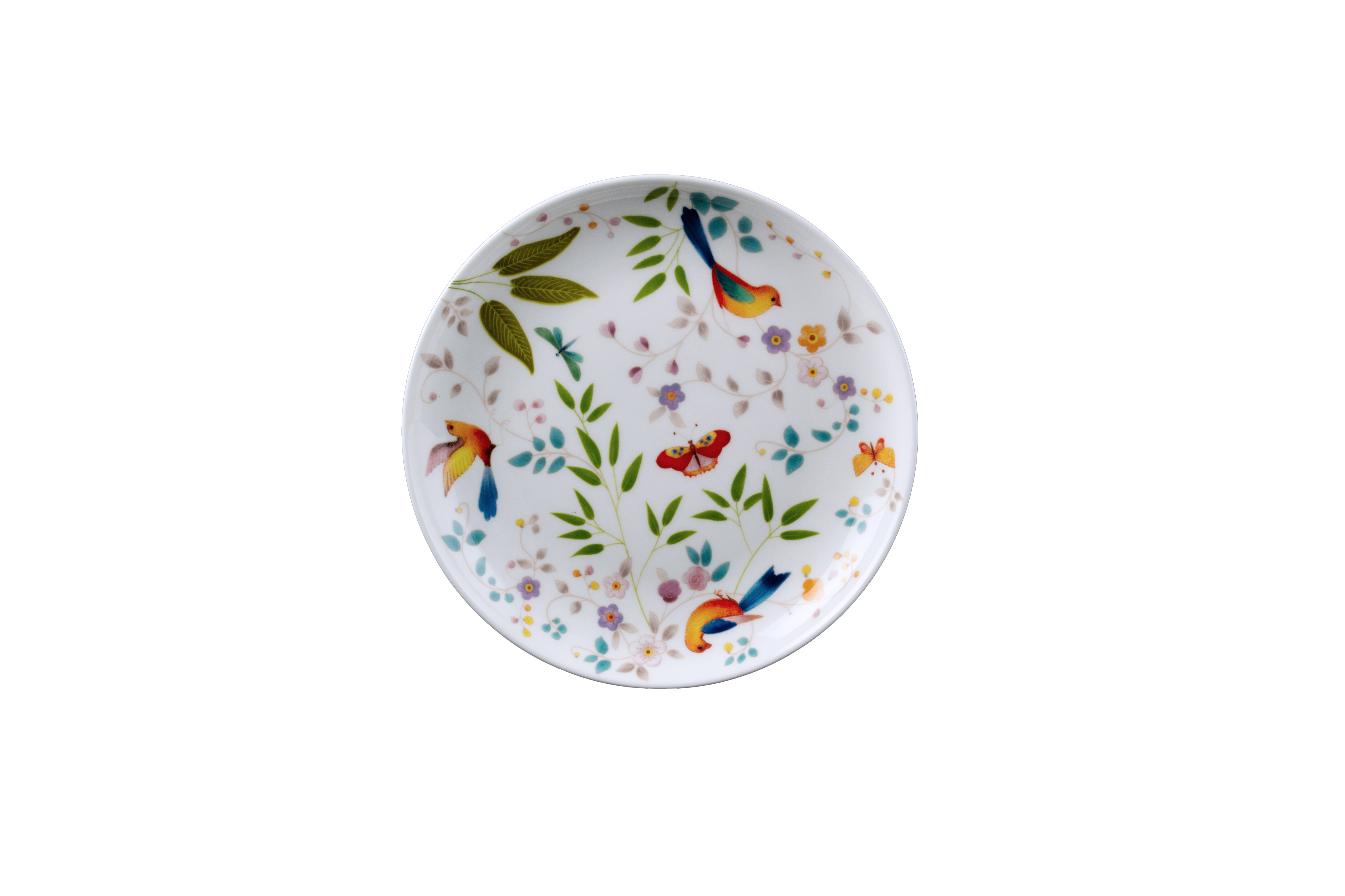 Il piattino pane e burro da 15 cm della collezione Incanto di Primavera è realizzato in delicata bone china e si distingue per il decoro romantico: rami fioriti, piccole foglie verdi, farfalle variopinte e uccellini si intrecciano su uno sfondo bianco luminoso. Ogni dettaglio trasmette la vivacità e la leggerezza della primavera, rendendo questo piattino perfetto per colazioni gioiose o mise en place raffinate che celebrano la natura e la rinascita stagionale.