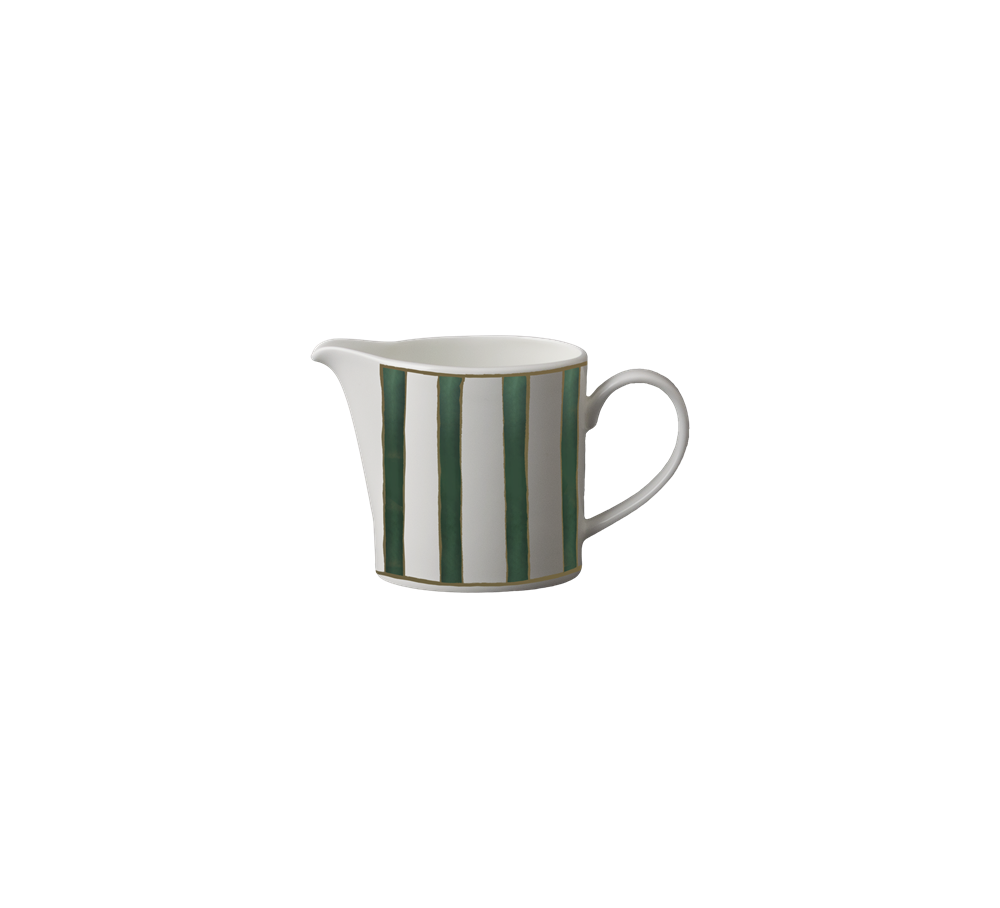 La lattiera Striche Verdi e Oro da 150 cc è realizzata in purissima bone china e decorata dal motivo a striche verdi, impreziosito da un elegante bordino dorato che rifinisce il bordo superiore. La combinazione tra il verde fresco e l'oro luminoso conferisce alla silhouette armonia e raffinatezza, senza rinunciare alla funzionalità quotidiana. Un accessorio prezioso e versatile, perfetto per completare con stile il servizio da tè o caffè firmato Geminiano Cozzi 1765.