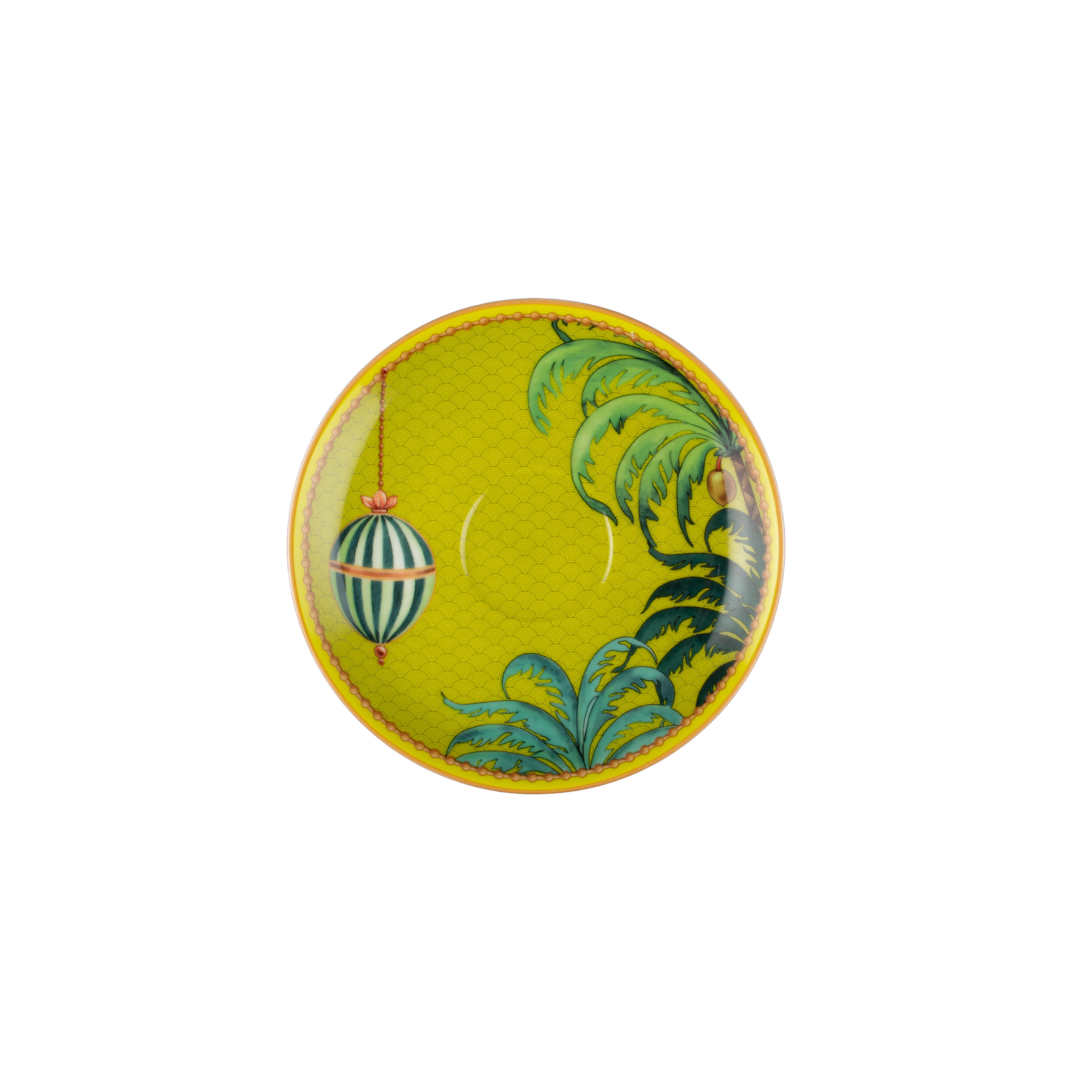 Il piattino da 15cm della collezione Teatro dei Sogni conquista con il suo fondo giallo acceso e i colori intensi che evocano atmosfere esotiche e immaginifiche. Le palme finemente stilizzate, il profilo dorato e il celebre uovo ?Striche Verdi? sospeso decorano la superficie in pregiata bone china, aggiungendo fascino e personalità a ogni pausa. Ideale per accompagnare la tazza da tè o cappuccino coordinata, trasforma la tua tavola in un piccolo teatro di eleganza, creatività e autentica raffinatezza firmata Geminiano Cozzi.