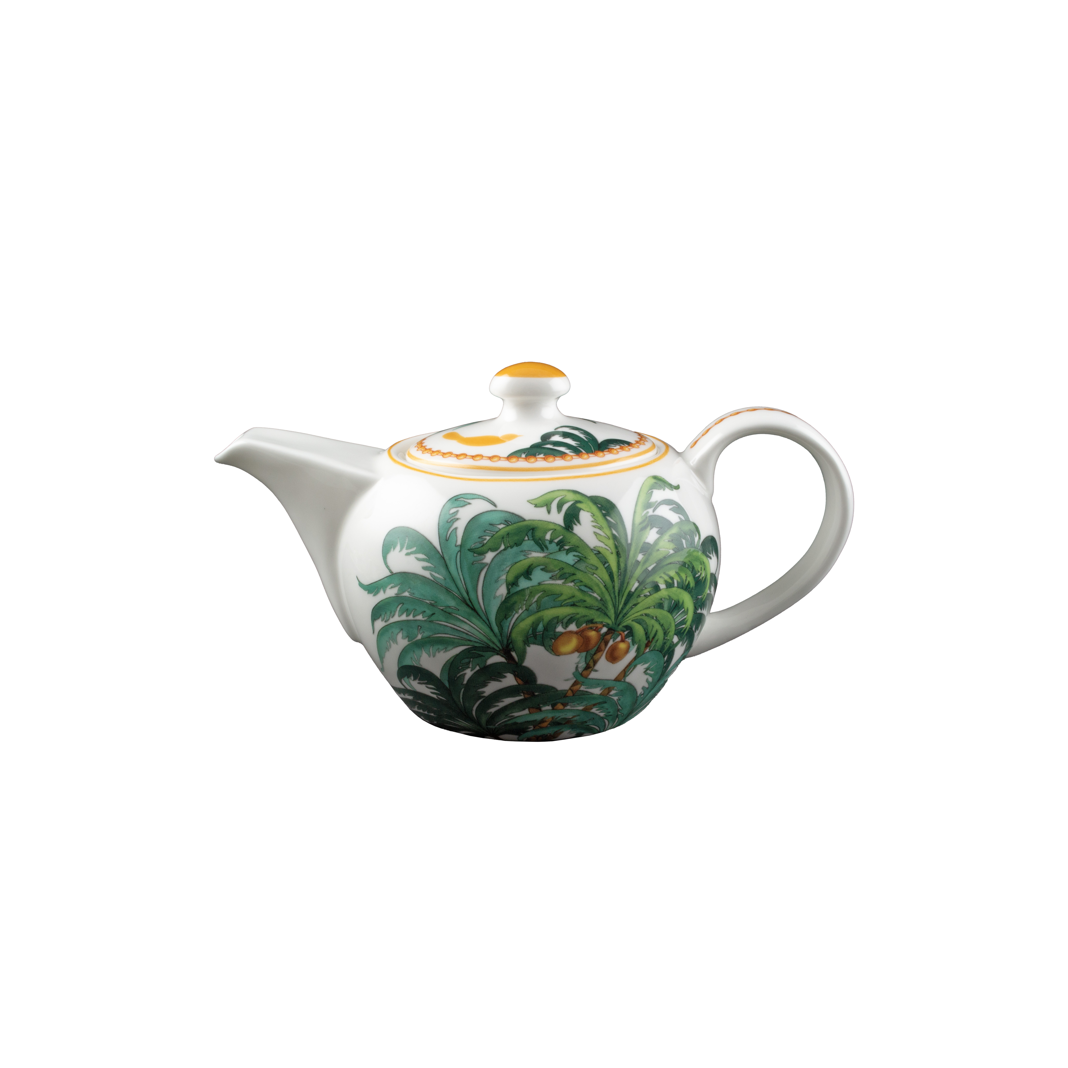 La teiera da 650cc della collezione Teatro dei Sogni è un'icona di eleganza e artigianalità veneziana. Realizzata in pregiata bone china, presenta un decoro scenografico con lussureggianti palme verdi e piccoli tocchi dorati, incorniciate da profili oro e accenti di giallo. Il design armonioso e la brillantezza del materiale rendono questo pezzo perfetto per accogliere e servire il tè in ogni occasione speciale. Una creazione firmata Geminiano Cozzi che porta in tavola arte, sogno e la magia di una tradizione senza tempo.