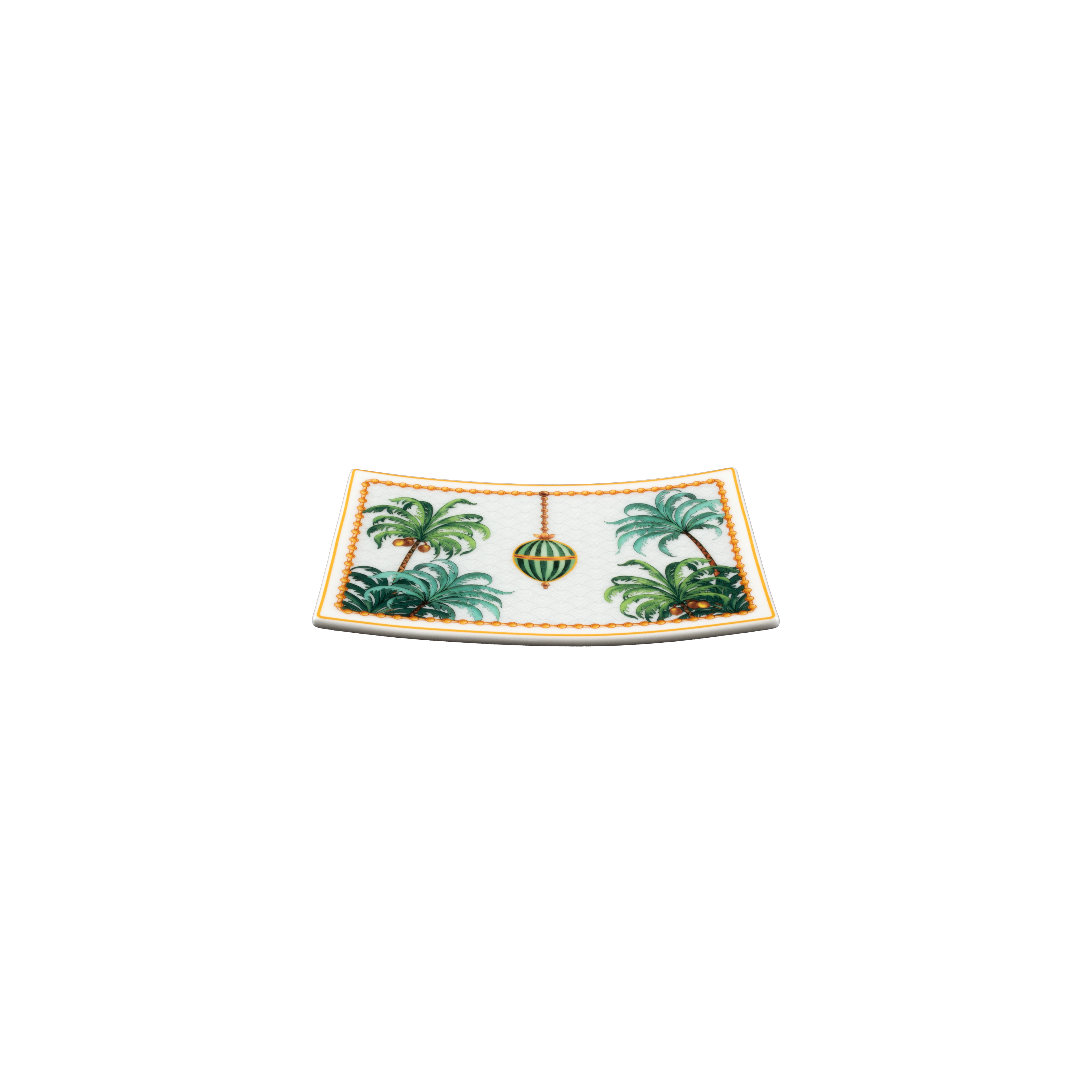 Il vassoio rettangolare da 15cm della collezione Teatro dei Sogni è una piccola scenografia che illumina la tavola con eleganza e creatività. In preziosa bone china, questo accessorio è decorato con palme verdi stilizzate, dettagli dorati e l'iconico uovo ?Striche Verdi? sospeso al centro, racchiusi da un raffinato bordo giallo. Perfetto per servire piccoli dolci, praline o finger food, aggiunge un tocco di atmosfera onirica e poesia alla mise-en-place, firmato Geminiano Cozzi.