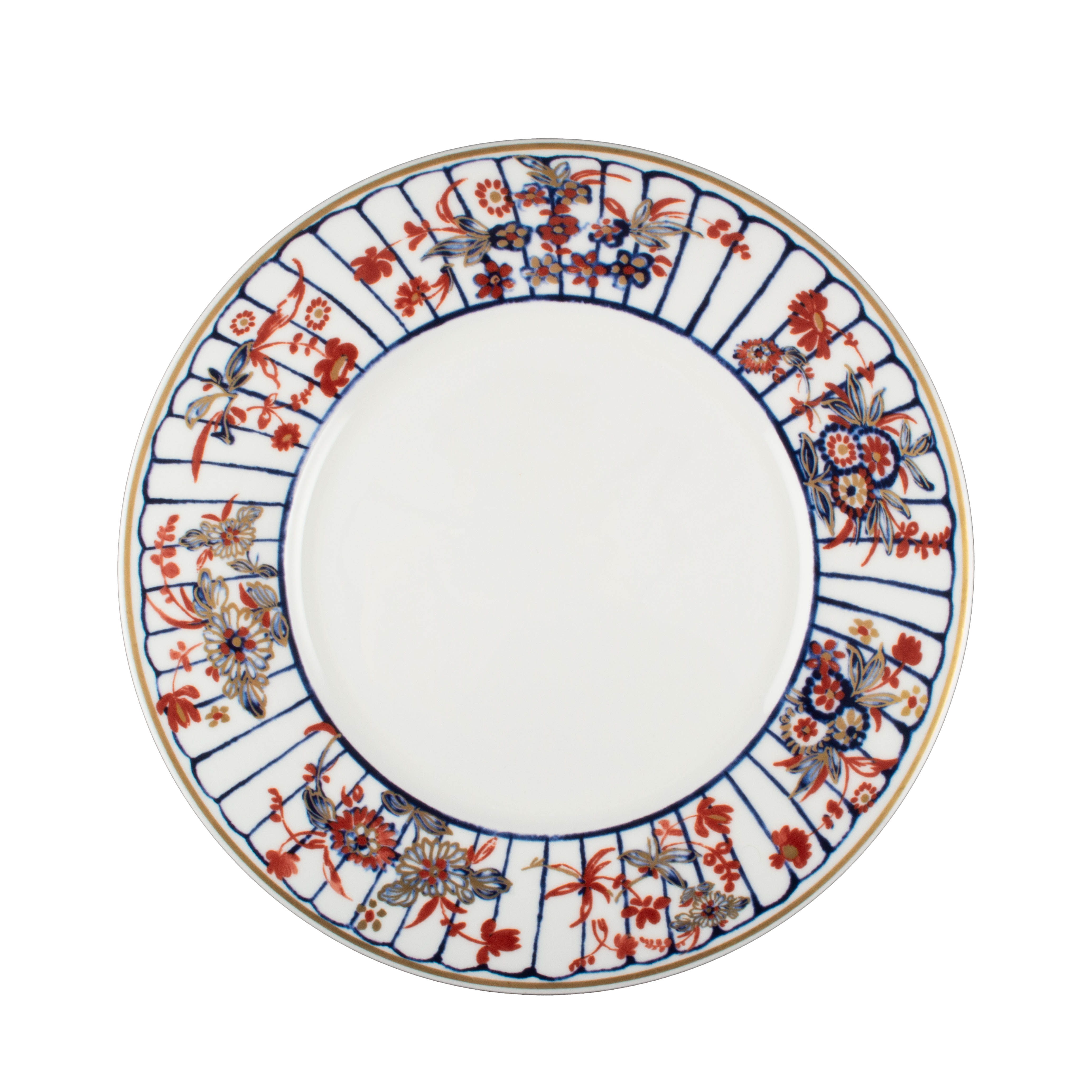 Tra le calli veneziane, dove i riflessi dell'acqua custodiscono segreti e memorie antiche, prende vita la collezione Striche, eredità del genio di Geminiano Cozzi, fedelmente mantenuta identica all'originale del Settecento per il suo inconfondibile splendore che brilla ancora oggi.Strisce di colore rosso, blu, verde, arancio, viola, celeste si espandono radialmente, incorniciate da una sottile pennellata d'oro di straordinaria raffinatezza, eseguita a mano e pertanto unica. Continua così il racconto della maestria artigianale veneziana, un sapere antico tramandato gelosamente di generazione in generazione.Sollevando un pezzo di questa collezione, si avverte sotto le dita il palpito immortale della Storia. Le sfumature vivide, i contrasti delicati: ogni dettaglio è stato curato con attenzione per incantare e perdurare nel tempo, riflettendo l'eterna bellezza della città che ha ispirato queste opere d'arte.