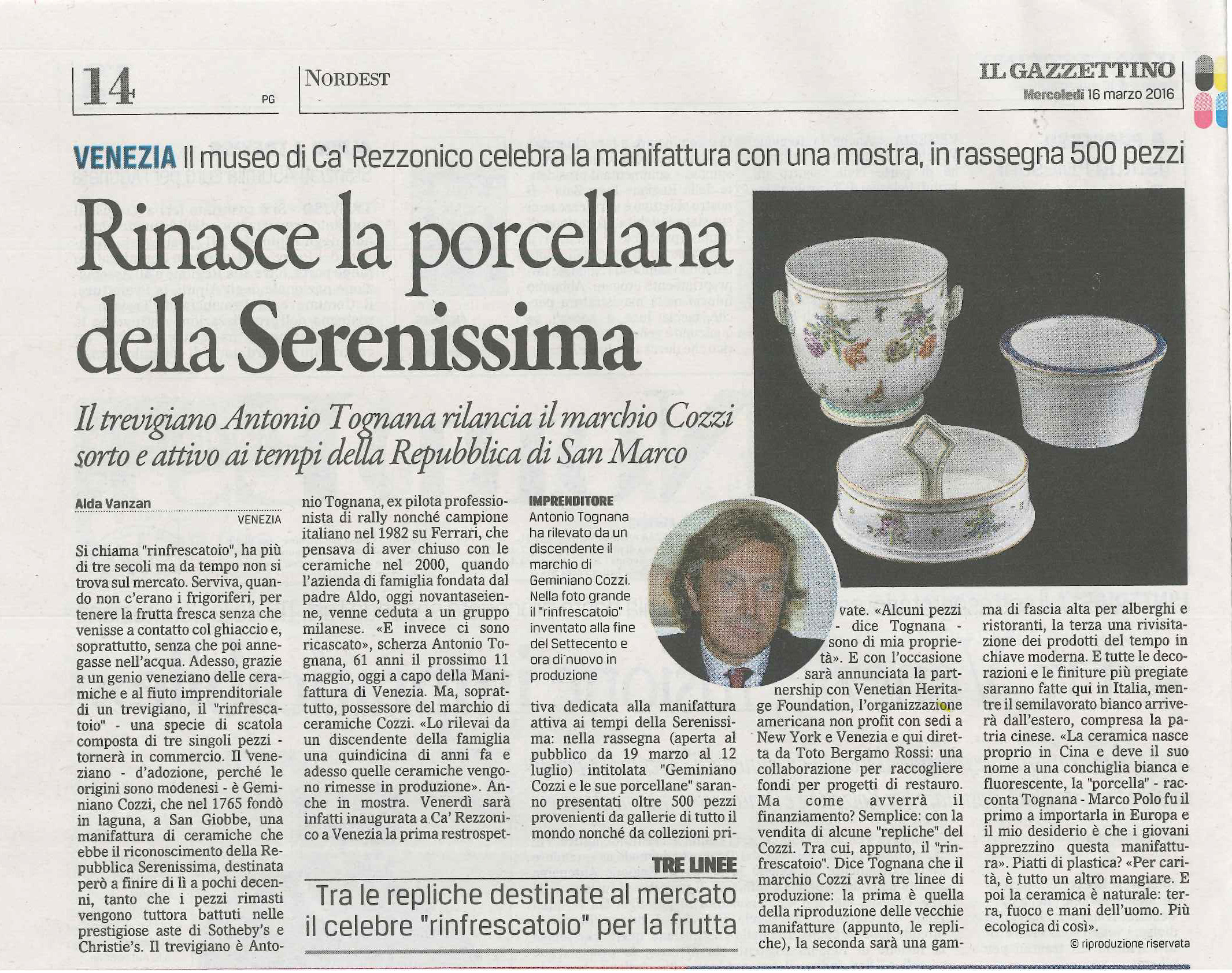 Antonio Tognana rilancia il marchio Geminiano Cozzi sorto e attivo ai tempi della Repubblica di San Marco.