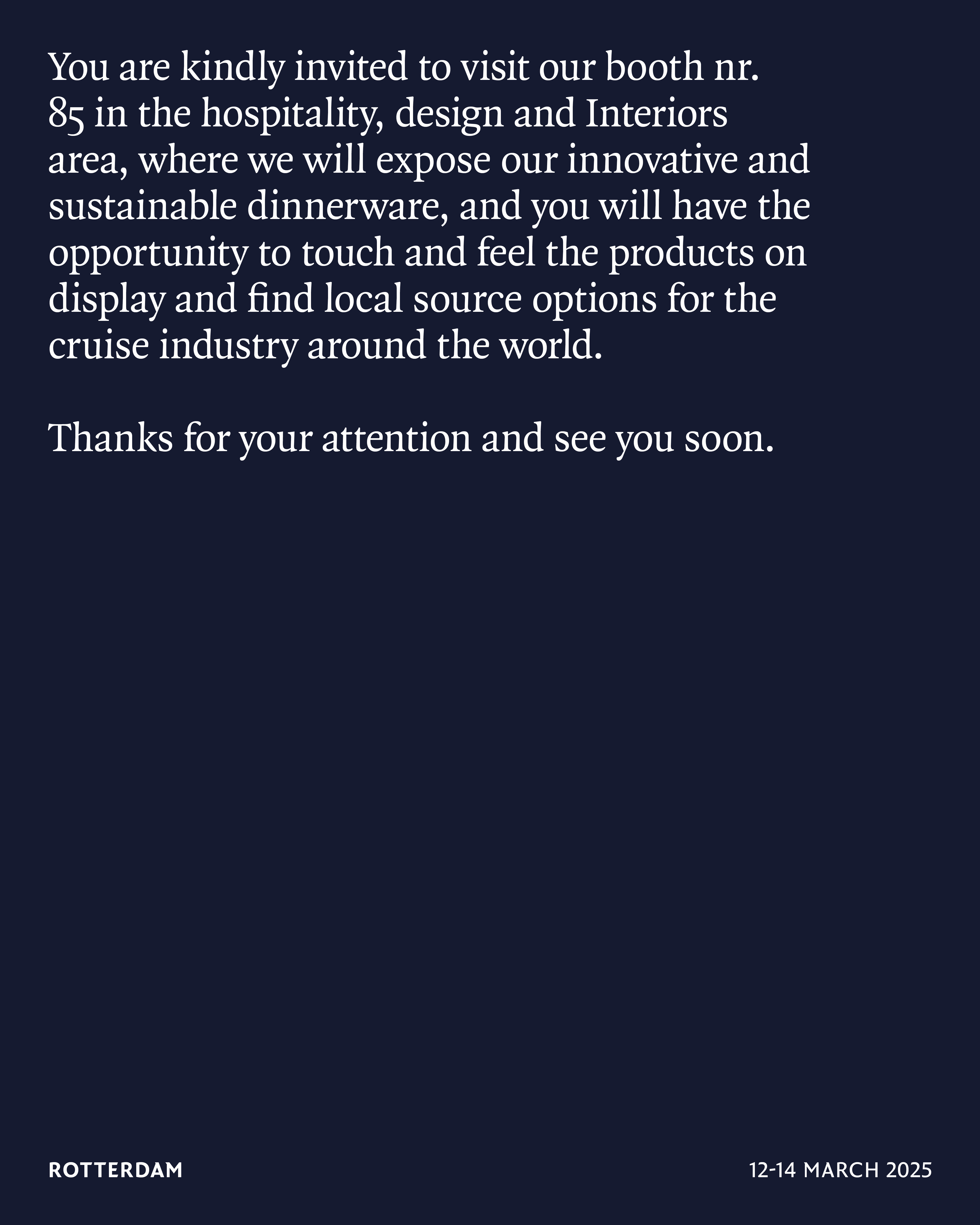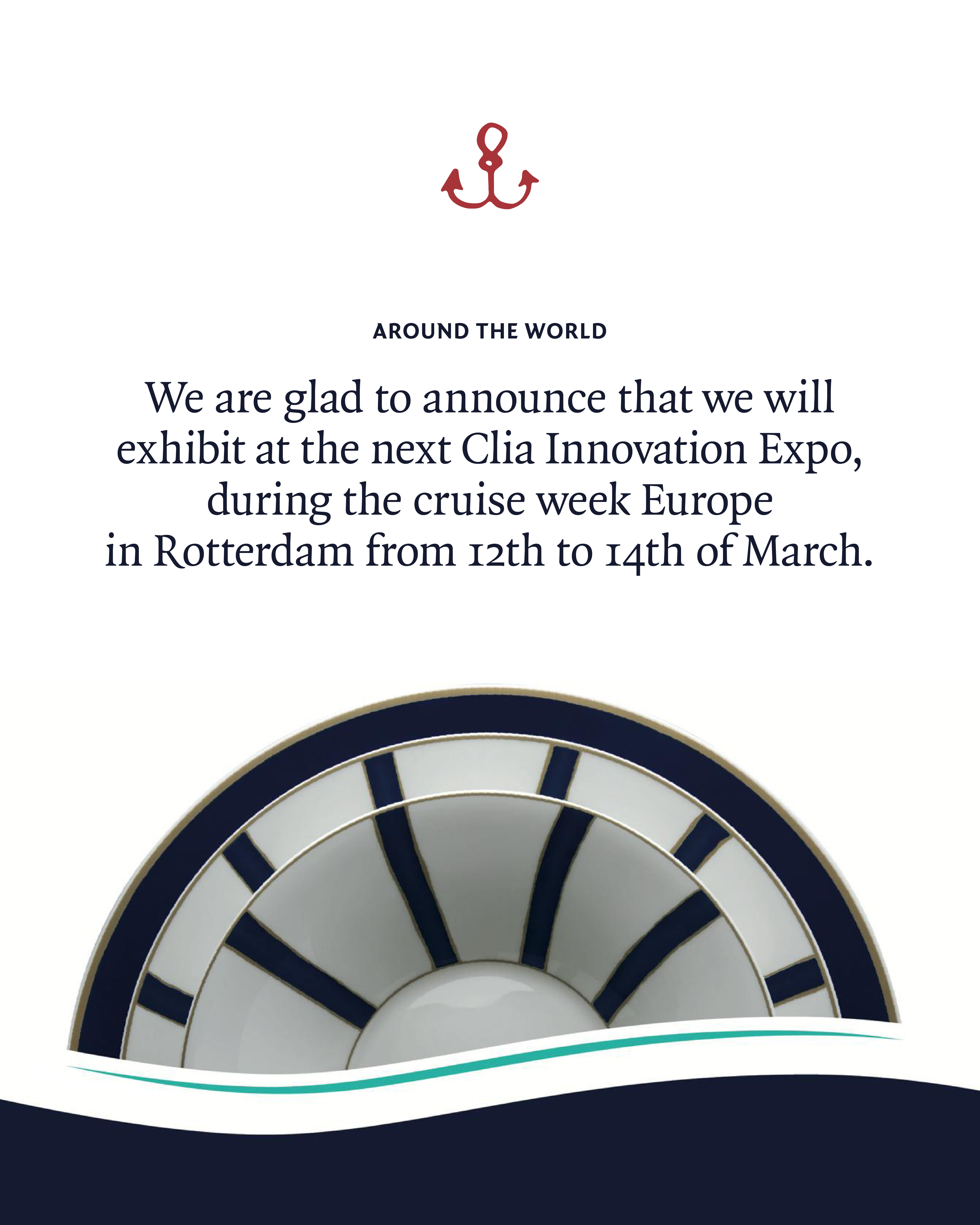 Manca poco alla partecipazione di Geminiano Cozzi Venezia 1765 a questa edizione della CLIA Cruise Week 2025 che si terrà a Rotterdam, dal 12 al 14 marzo. Vi aspettiamo allo stand 85 dell'aera dedicata all'ospitalità, al design e agli interni.