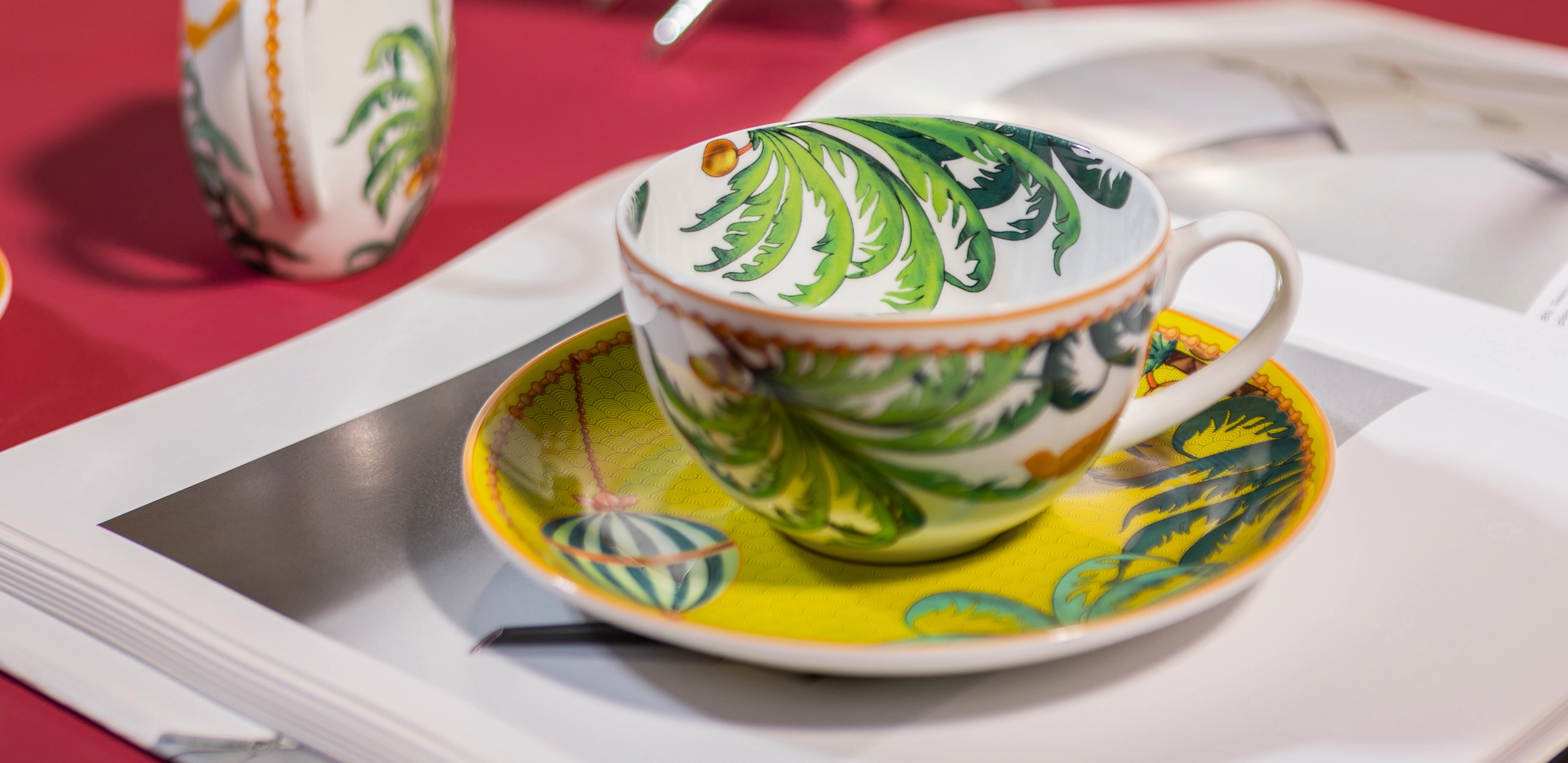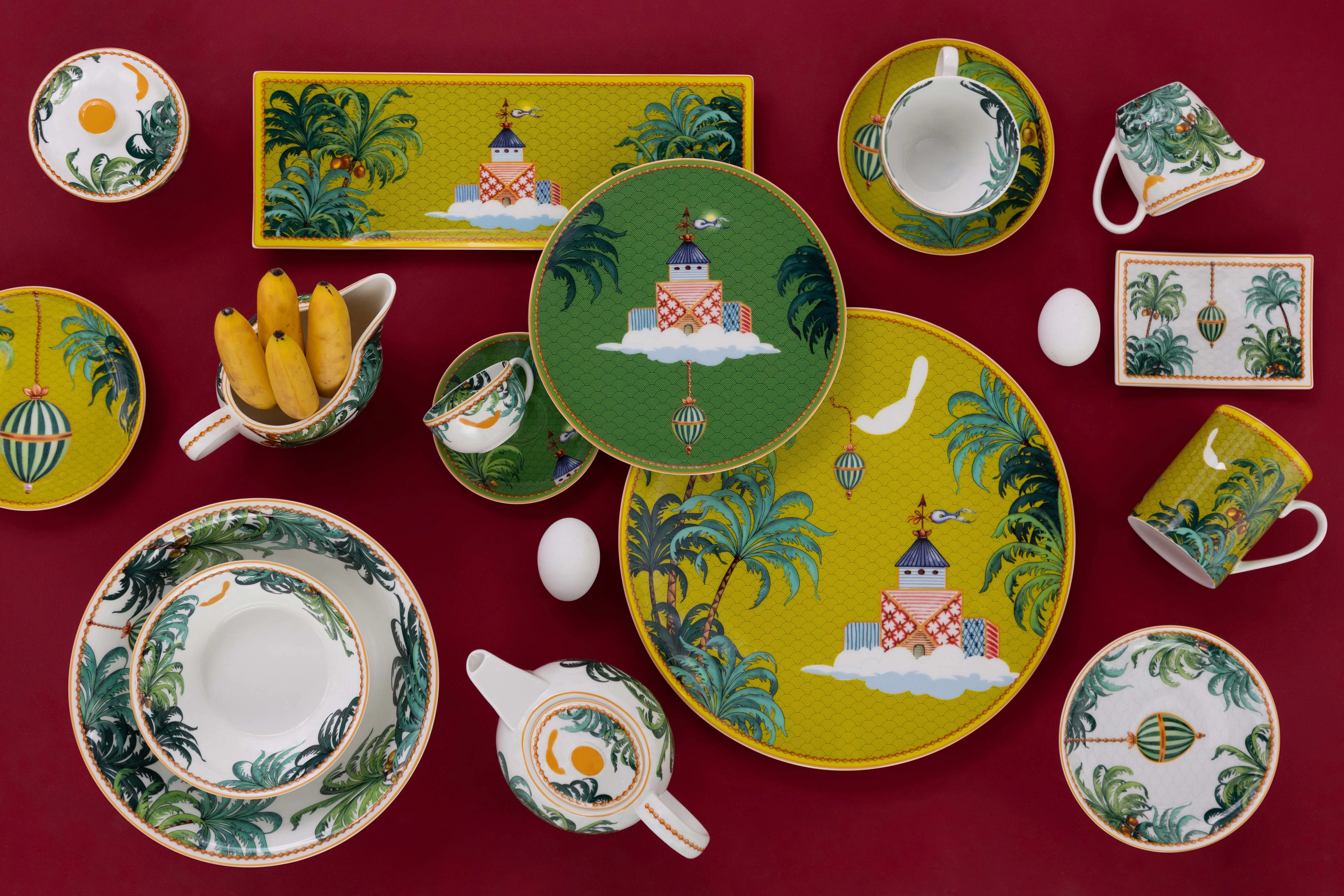 Entrando in un teatrino orientale che fluttua tra le nuvole - un ponte tra Occidente e Oriente che ispirò il Teatro del Mondo di Aldo Rossi - ci troviamo in un mondo onirico. Qui, la tavola diventa una finestra su universi surreali, ricchi di simbolismi. Le palme circoscrivono questo viaggio introspettivo, mentre un uccellino bianco ci guida, portando al becco una catenella collegata ad un uovo decorato con Striche Verdi, firma di Geminiano Cozzi. L'uovo, omaggio a Piero della Francesca, bilancia razionalità e fantasia, riportandoci nel presente, a Venezia. "Teatro dei Sogni" celebra il potere dell'arte di trasformare l'ordinario in straordinario, offrendo un angolo di sogno pronto da apparecchiare.