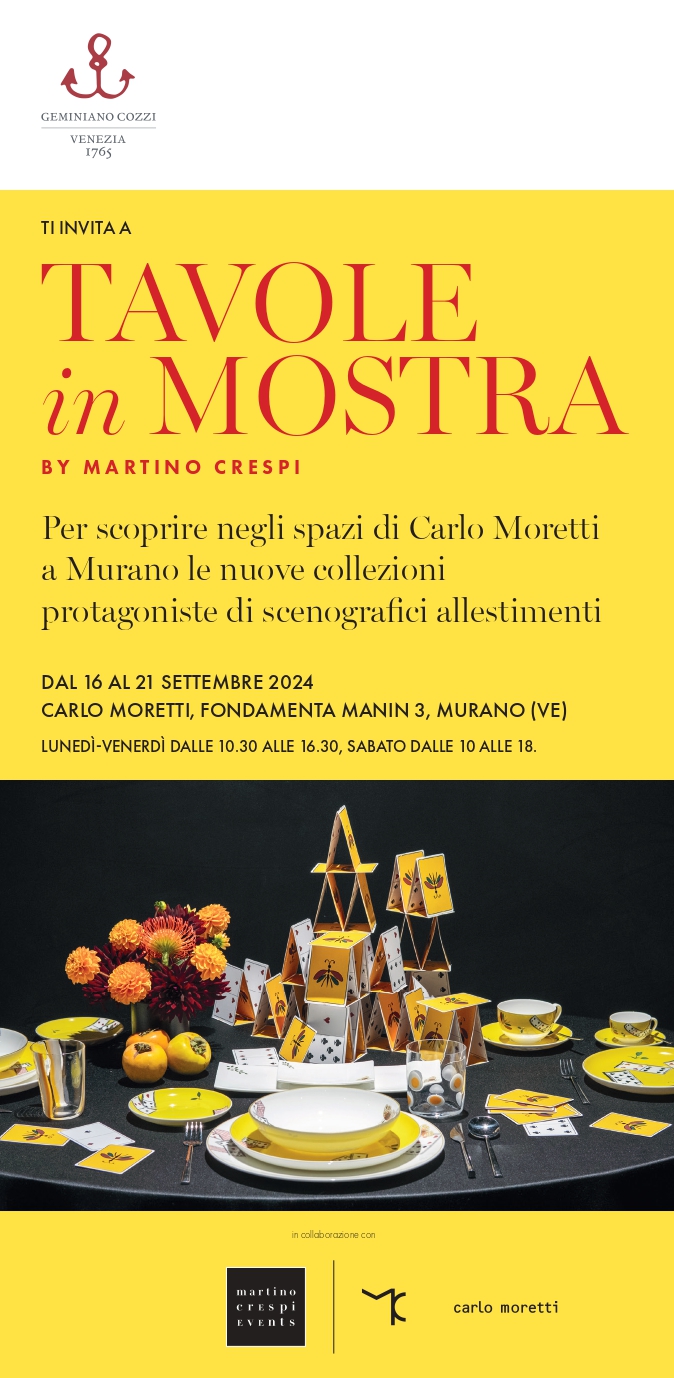 "Tavole in mostra", l’evento creato da Martino Crespi per la settimana del design milanese, si sposta a Murano per animare la Glass Week, un festival internazionale fondato nel 2017 che, dal 16 al 22 settembre, celebra la tradizione della millenaria arte vetraria animando tutta la città di Venezia e la laguna. Eventi, esposizioni, incontri, laboratori, visite guidate alle fornaci di Murano…. E proprio Murano ospita quella della Carlo Moretti Venezia, una delle più note a livello internazionale dove Martino Crespi, indiscusso maestro della mise en table, allestirà tavole da sogno con le porcellane di Geminiano Cozzi 1765. Profondo conoscitore delle molteplici collezioni di Geminiano Cozzi 1765, al fianco della manifattura fin dal momento della sua rinascita, Martino ama giocare con i decori, le forme per dar vita con i nostri oggetti agli eventi dei brand più prestigiosi che lo impegnano costantemente. Protagoniste, per accompagnare i vetri di Carlo Moretti, Martino Crespi ha selezionato alcune tra le collezioni di Geminiano Cozzi 1765 in fine bone porcelain: dal bianco assoluto delle forme pure alle iconiche Striche, il decoro signature del brand, dalla collezione El Leon omaggio a Venezia, a quella delle Carte da Zogo che dal 1770 continua a mietere consensi. Per dare emozioni, per suggerire azioni, per celebrare la manualità e la bellezza, le porcellane di Geminiano Cozzi 1765 saranno esposte, dal 16 al 21 settembre, nella sede della fornace di Carlo Moretti Venezia, Fondamenta Manin 3, Murano.